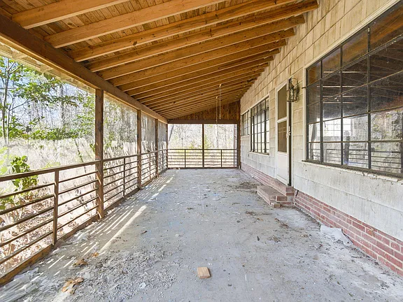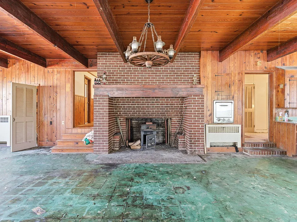 Complementing the beams is an enormous fireplace that anchors the room and creates a warm, inviting atmosphere. Whether hosting gatherings or enjoying a quiet evening, this space has the potential to become the heart of the home.