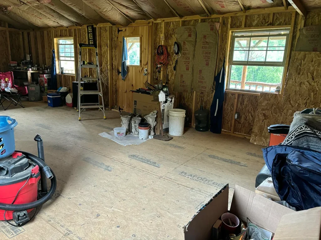 Inside the cabin, early-stage interior work has already begun. Electrical wiring has been installed to meet 110-volt service, providing a solid foundation for lighting, outlets, and modern conveniences. Insulation has also been added, an important step that enhances comfort, energy efficiency, and year-round usability. Additionally, the framing of interior rooms has been started, giving a clear sense of layout and making it easier to imagine how the space can be tailored to your needs—whether you envision a cozy one-bedroom hideaway, a rustic studio, or a multi-room cabin designed for family and guests.