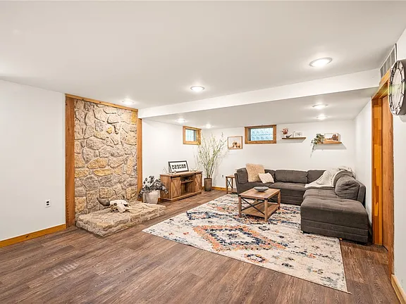 - A striking stone fireplace that serves as the centerpiece of the living space