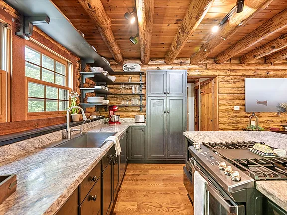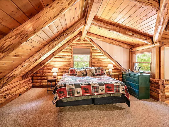 The combination of rustic materials and modern systems makes the home appealing to buyers seeking a move-in-ready cabin with character.
