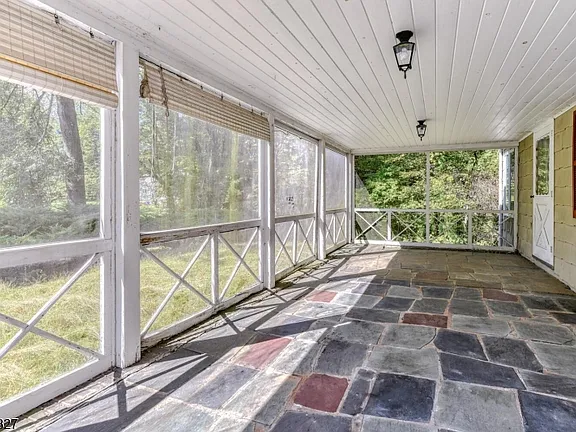 At the back of the house, a screened rear porch offers a protected outdoor area where residents can enjoy the surrounding nature without worrying about insects or weather conditions. Screened porches are particularly appreciated in wooded environments like the Watchung Mountains.