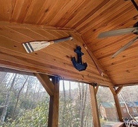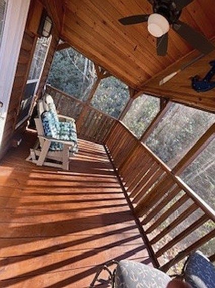 At the main entrance, a large screened porch provides the perfect spot for morning coffee, reading, or enjoying the gentle sounds of nature without worrying about insects. This porch acts as an extension of the living space and sets the tone for relaxed living.