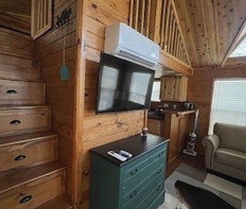 The heart of the home is the open-concept kitchen and living room, where vaulted ceilings create a sense of spaciousness far beyond what you’d expect from a tiny home. Large windows allow natural light to pour in, highlighting the craftsmanship and thoughtful design throughout.