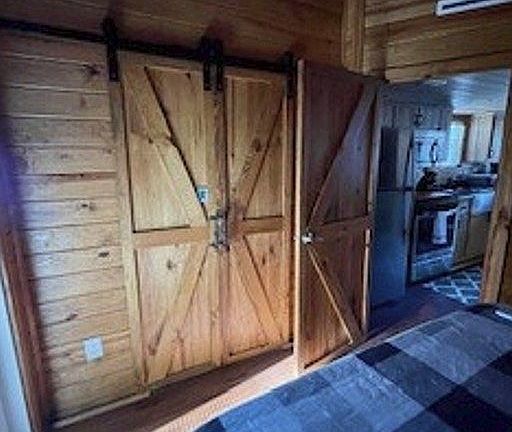 The main-level bedroom features a vaulted ceiling, enhancing the sense of openness and comfort. A generous closet provides ample storage, while the bedroom’s layout allows easy access to one of the home’s standout features—its private screened porch.