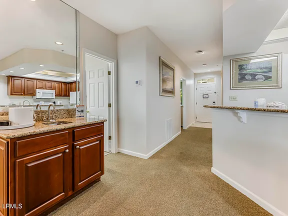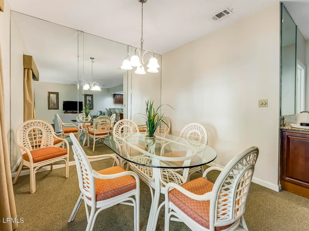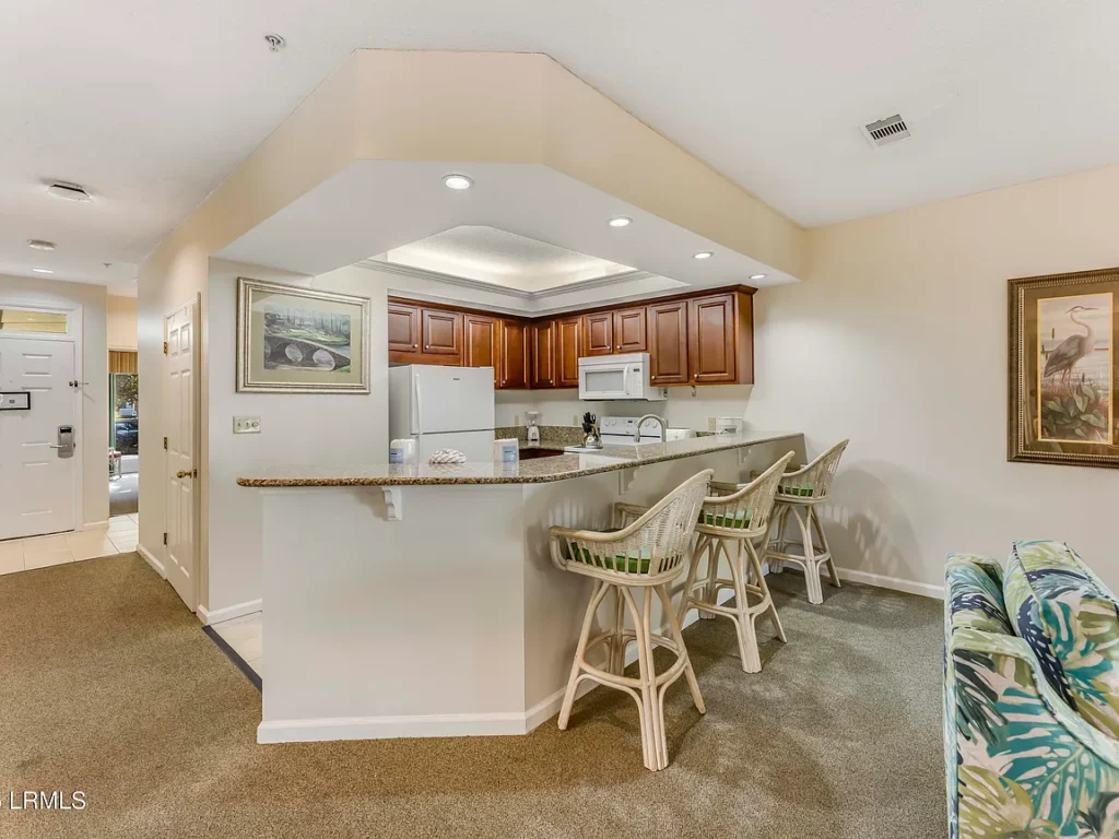 The living area is open and airy, blending seamlessly into the dining space and kitchen. With around 1,300 heated square feet, the villa feels far larger than your typical beach condo. Large windows allow natural light to fill the rooms, bringing in the relaxed coastal atmosphere Hilton Head is known for. The kitchen is functional and accommodating, perfect for preparing meals or snacks during your stay without feeling confined or cramped. Everything about the villa’s design prioritizes comfort, convenience, and enjoyment.