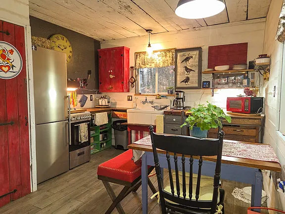 The living room is the heart of the home — cozy, bright, and anchored by a beautiful woodstove that adds both style and function. Imagine curling up with a blanket and a good book while the wood fire crackles on a snowy evening. For day-to-day comfort, the home is equipped with in-floor radiant heating, ensuring consistent warmth from the ground up through the cold months.