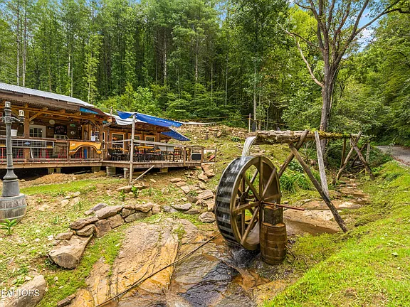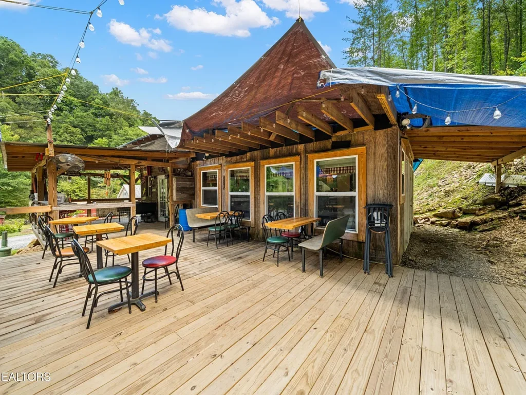 Enhancing the commercial space is an additional 602 square feet of covered outdoor seating, perfectly positioned to overlook a picturesque water wheel that adds to the authentic mountain ambiance. The sound of flowing water, combined with the natural surroundings, creates an inviting atmosphere that guests will remember long after they leave. A custom-built stage for live music further elevates the property’s appeal, making it ideal for concerts, festivals, community gatherings, and special events.
