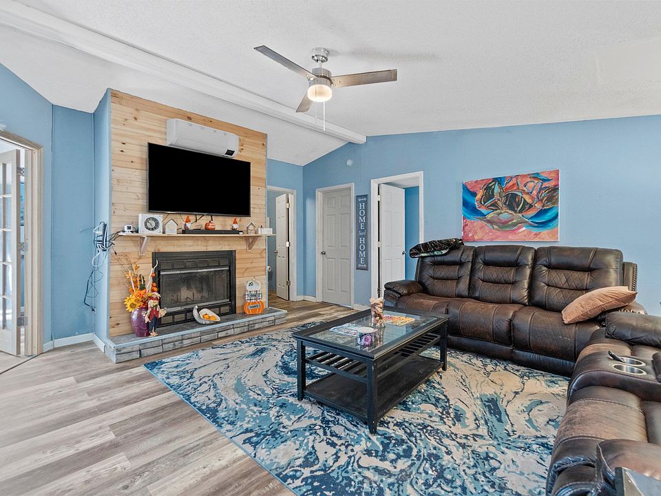 The living room is the centerpiece of the home — featuring high ceilings that enhance the sense of openness and natural light. A fireplace anchors the space, offering warmth and ambiance during cool evenings. Whether you’re gathered around for movie night, enjoying quiet time with a good book, or hosting friends, this space combines comfort and style in equal measure.