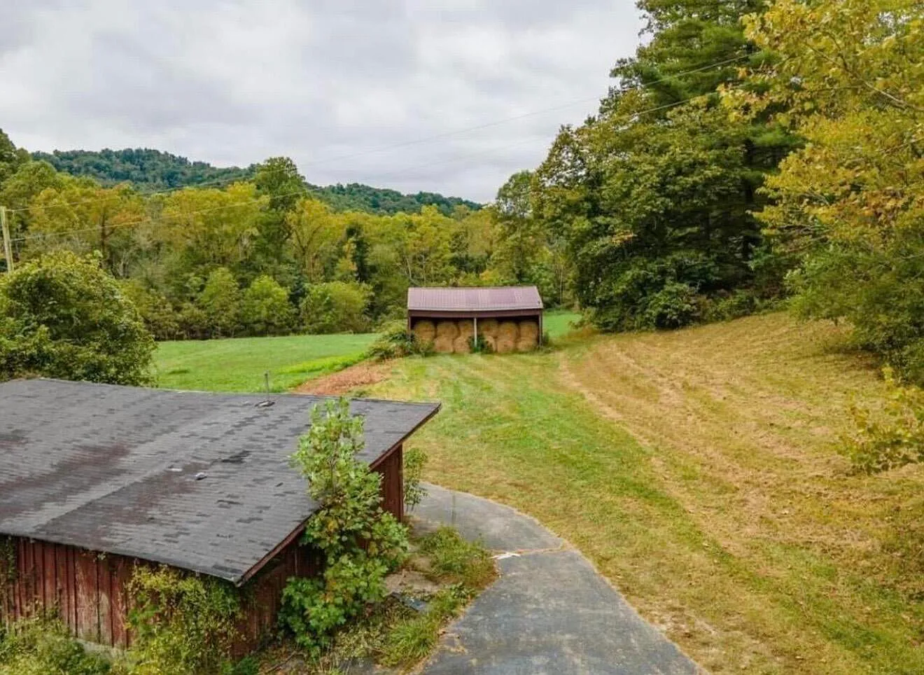 The acreage includes both cleared bottomland and wooded hills, which creates a balanced mix of uses. The open areas are already used for hay and could also support livestock. Meanwhile, the wooded sections provide space for hunting or trail use. A small creek runs near the back, which adds a natural water feature. Because of the varied terrain, the land may suit both agricultural and recreational needs.