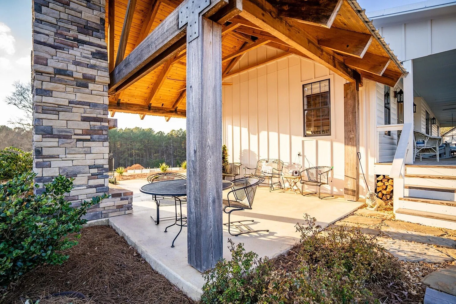 The house was expanded and remodeled in 2023. That work added a larger primary bedroom, updated bathroom, and additional living space. The renovation also included a redesigned kitchen and new functional rooms. Because the upgrades are recent, many systems and finishes are modern. Two gas log fireplaces provide additional heat sources. One sits inside the living area, while another appears on the covered patio outside.
