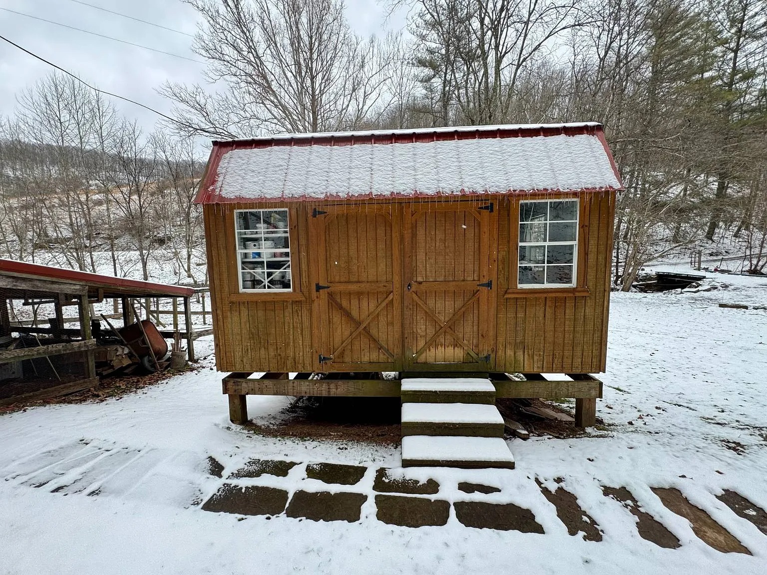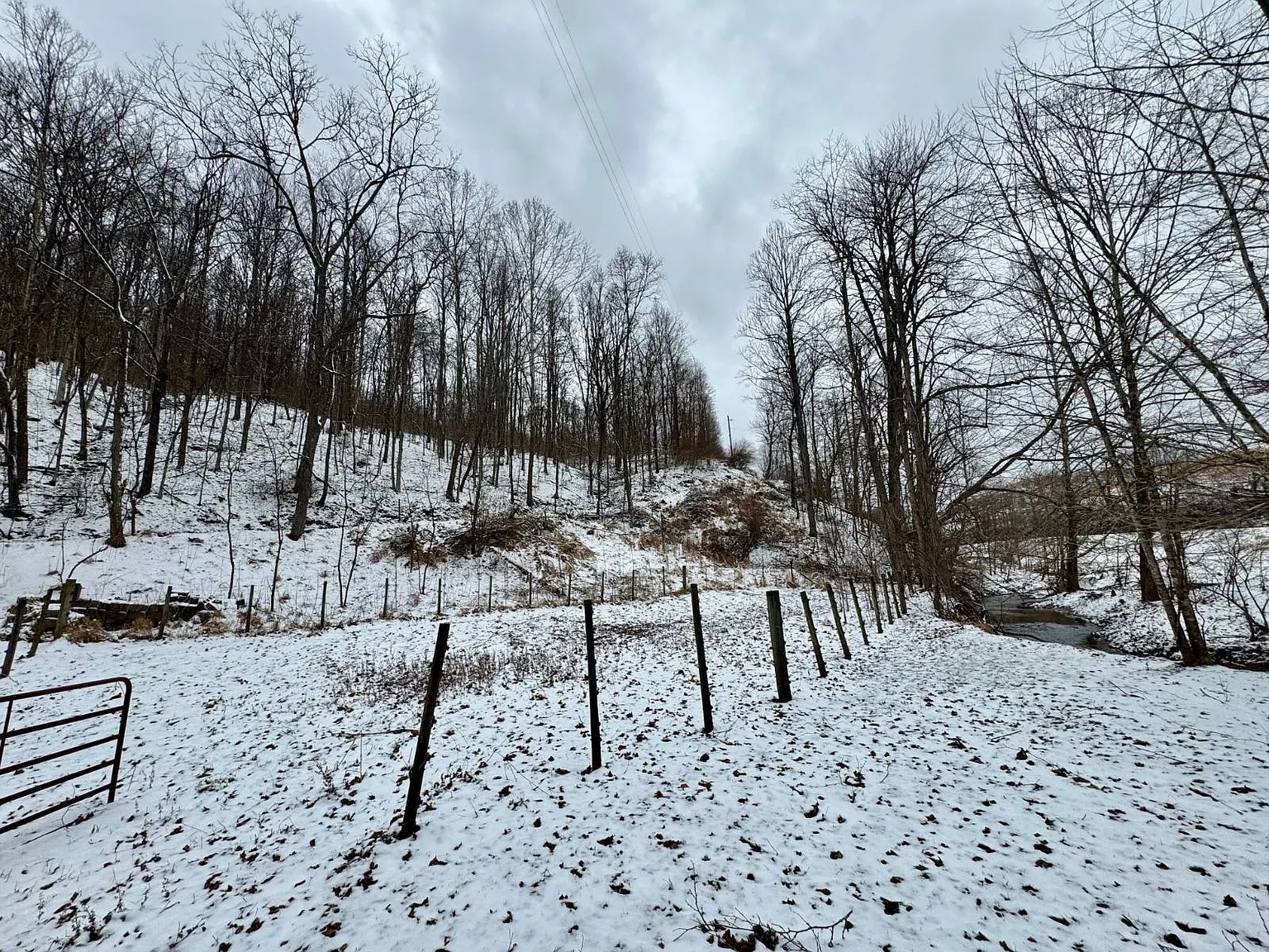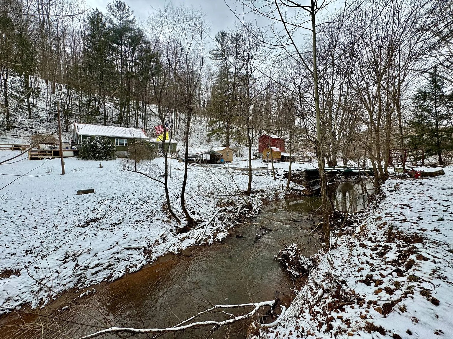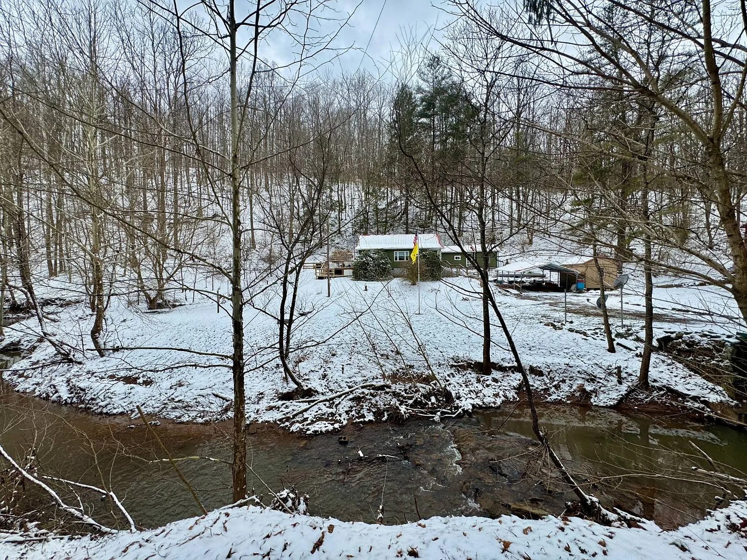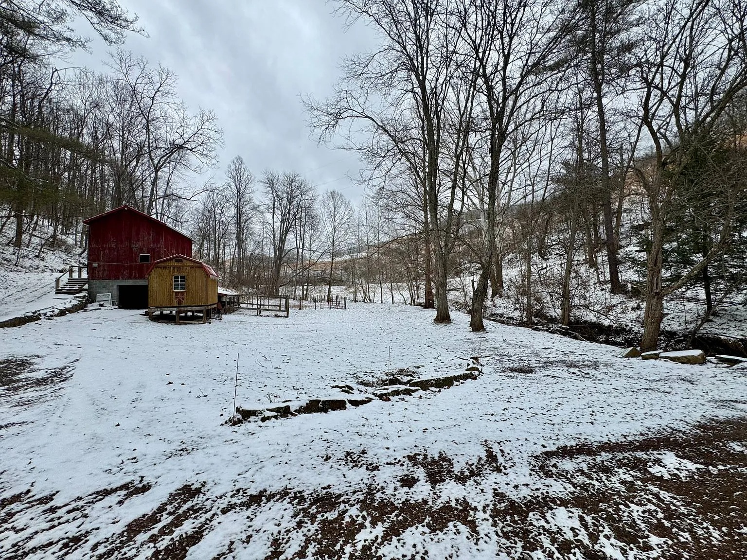 The 66.1 acres combine meadow, woods, and water. Bear Fork stream runs through the property, adding both scenery and natural sound. A renovated barn sits on a concrete block foundation with a metal roof. Two additional utility buildings include loft space and gas heaters. A rebuilt cellar house provides extra storage with electric lighting. Because of the open meadow areas, livestock or gardening could fit here. The surrounding woods create privacy and room to explore.
