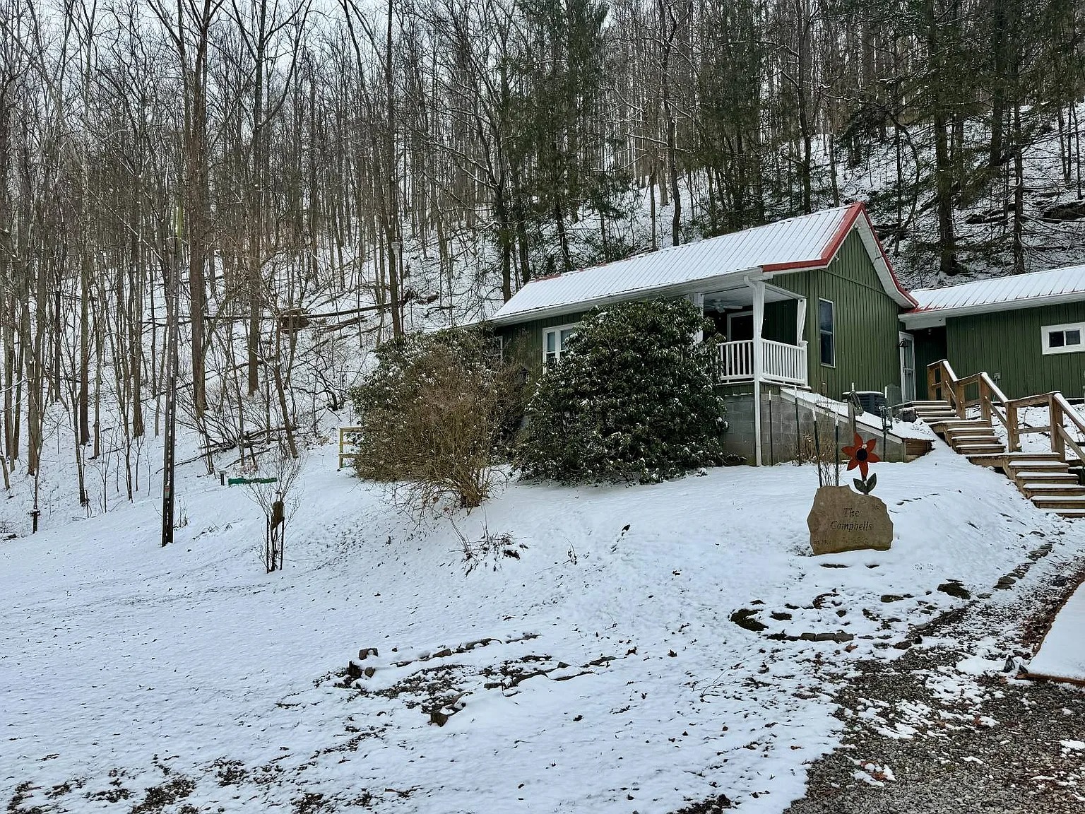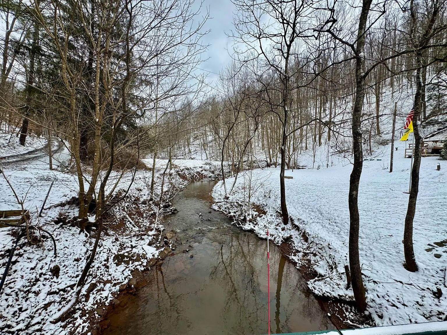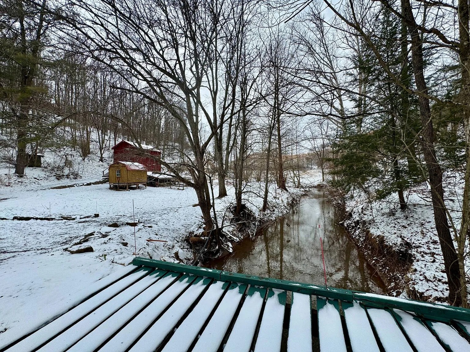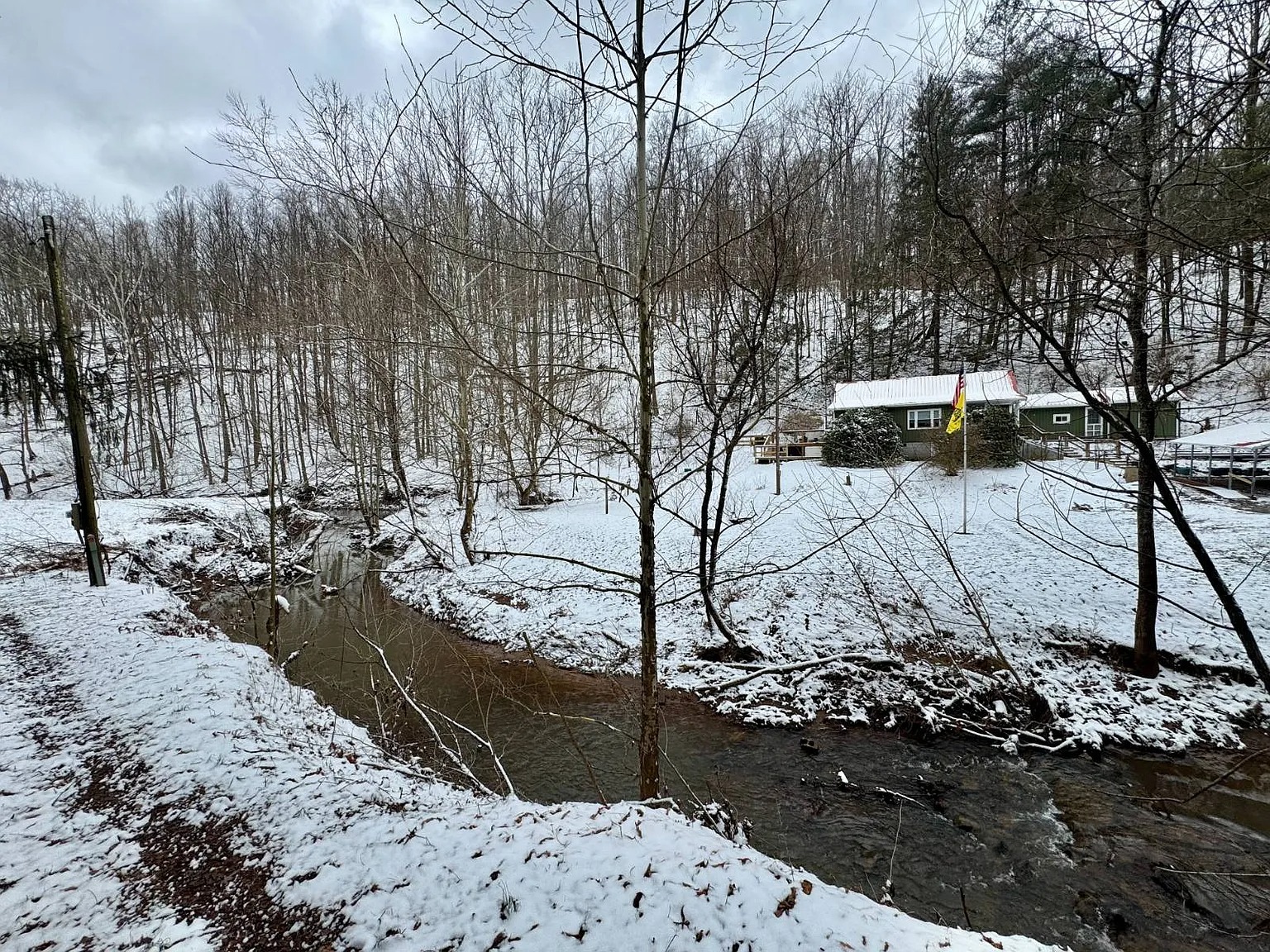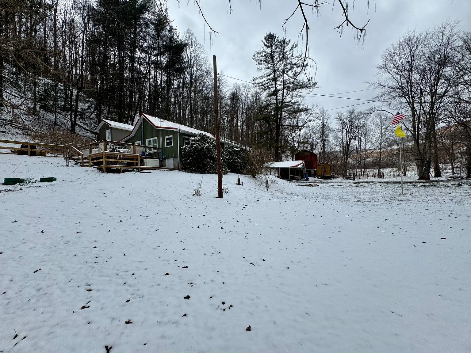 The 66.1 acres combine meadow, woods, and water. Bear Fork stream runs through the property, adding both scenery and natural sound. A renovated barn sits on a concrete block foundation with a metal roof. Two additional utility buildings include loft space and gas heaters. A rebuilt cellar house provides extra storage with electric lighting. Because of the open meadow areas, livestock or gardening could fit here. The surrounding woods create privacy and room to explore.