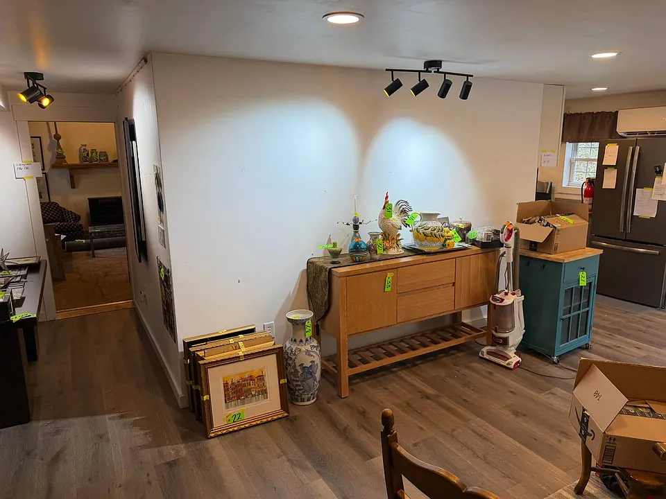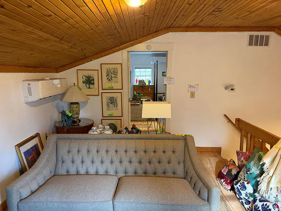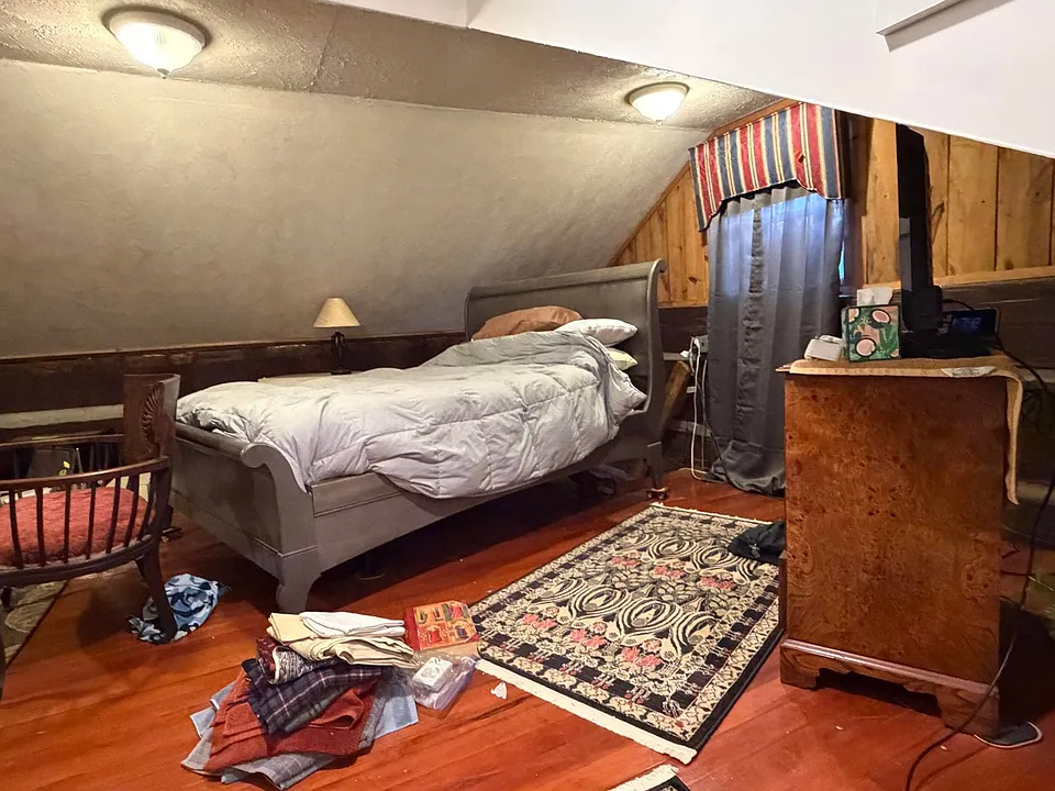 The living room offers a more intimate setting, ideal for relaxation and quiet evenings. Anchored by a beautiful stone hearth, this space embodies the cozy appeal of classic cabin living. It’s easy to imagine curling up here on cooler nights, enjoying the comfort and charm that only a home like this can provide.