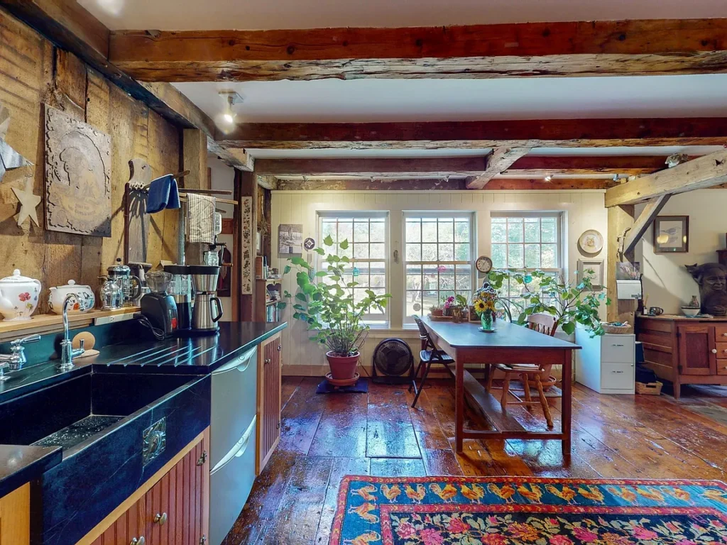 Inside the home, history and comfort come together in a warm, welcoming layout that feels both expansive and intimate. The heart of the home is the open kitchen, where rich wood floors and exposed ceiling beams immediately set the tone. Soapstone countertops add both beauty and durability, and the generous layout provides plenty of space for cooking, gathering, and making memories. This is a kitchen designed for real living—whether hosting family dinners, holiday celebrations, or quiet mornings with coffee and sunlight streaming in.