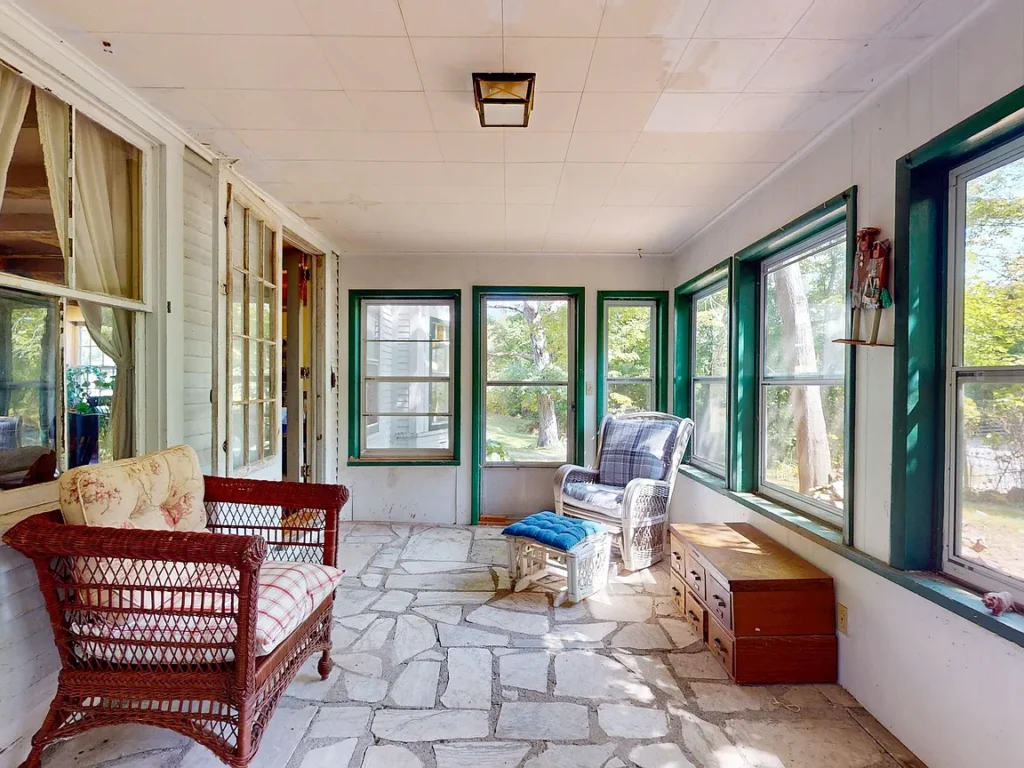 An enclosed three-season porch offers a peaceful space to read, write, or simply enjoy views of the surrounding land while being sheltered from the elements. This space extends the living area and invites you to slow down and savor the quiet moments.