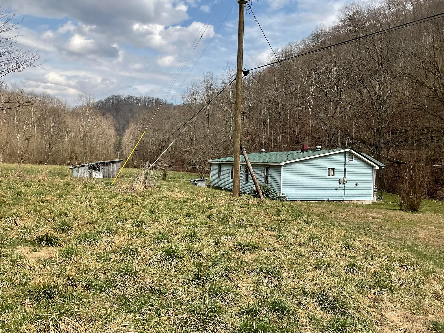 A four-bedroom home sits on 30.92 acres in Big Creek, Kentucky, with a mix of flat land and mountain surroundings. The house includes one bathroom and about 1,320 square feet of living space. This property combines a small residence with usable farmland and natural features. Because of that, it may suit homesteading or a renovation project. In addition, the land borders the Daniel Boone Forest, which expands outdoor access beyond the property itself.