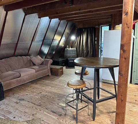 The cabin features a loft area accessed by a striking spiral metal staircase. This staircase not only adds character and visual interest, but also connects the main living area to both the loft and the basement level, creating a functional vertical layout. The loft itself has the potential to be transformed into a sleeping area, creative studio, reading nook, or additional living space, depending on your vision. With proper finishing, lighting, and insulation, this loft could become one of the most charming features of the home.