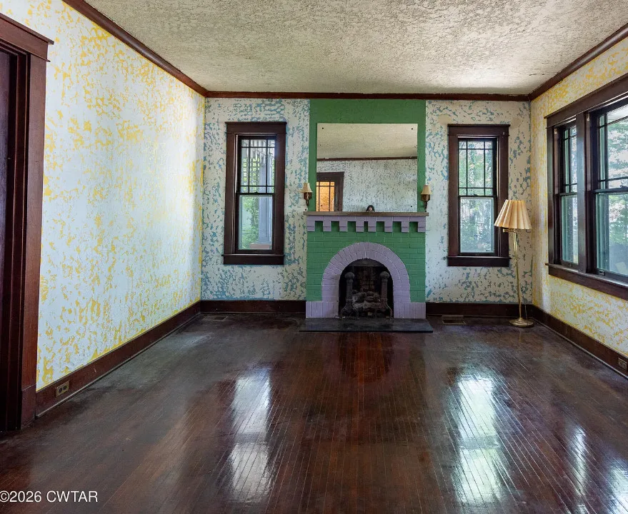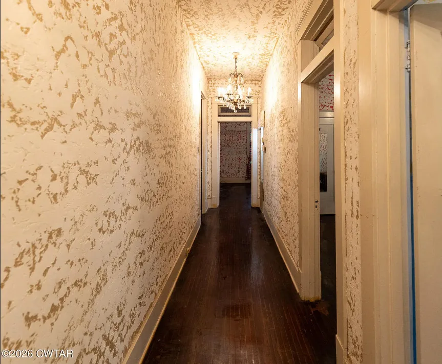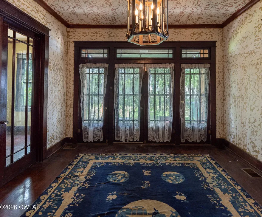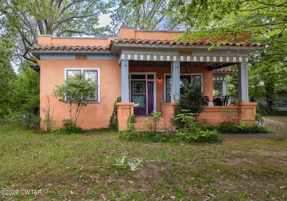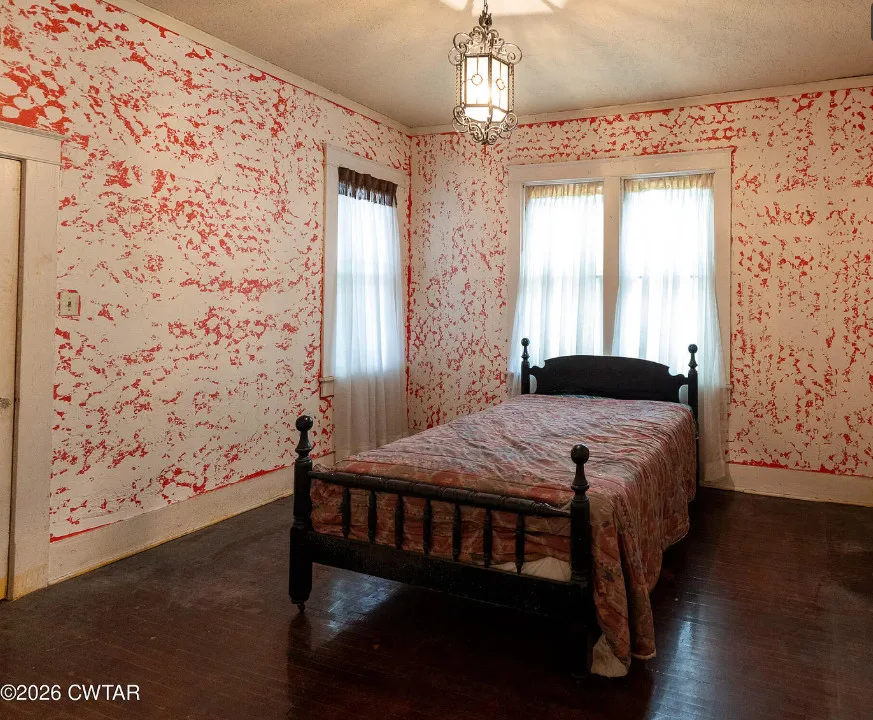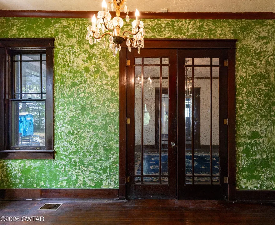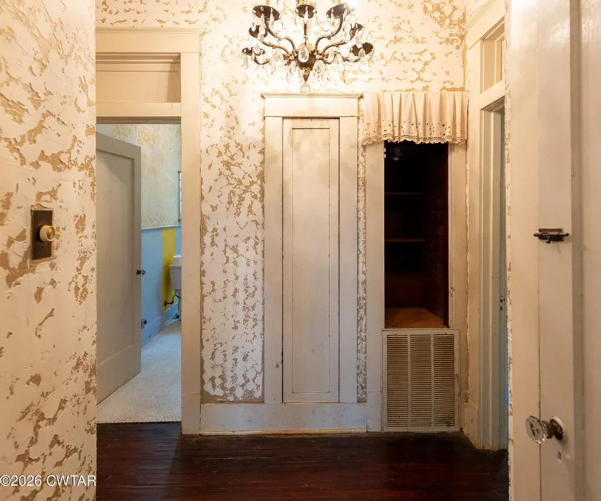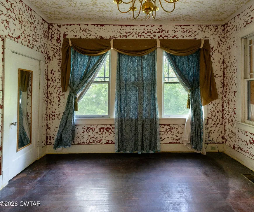 This house has lots of potential! Interior surprised me considering the price. Question, are the walls supposed to be like that? I am guessing it is some trendy DIY sponge paint thing? The house was built in 1925. It is located on .71 acre in Milan, Tennessee. This Mission Revival/Spanish Eclectic house features a covered front porch, gleaming wood floors, crown moulding, baseboards, unpainted millwork, french doors, crystal chandelier, transom windows and wainscoting. The location might not be ideal with commercial across the street. Three bedrooms, two bathrooms and 2,044 square feet. $150,000