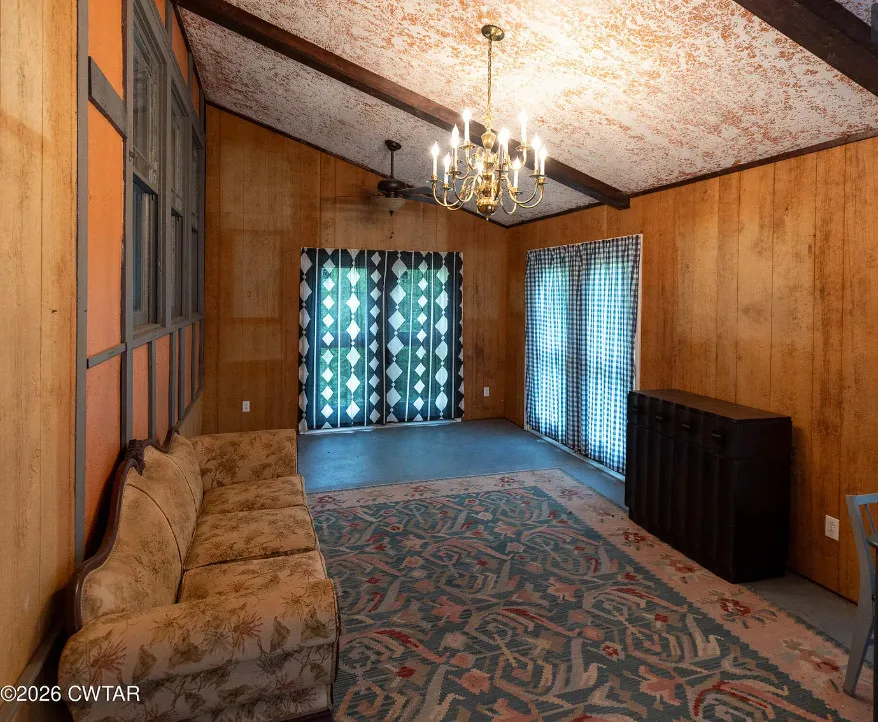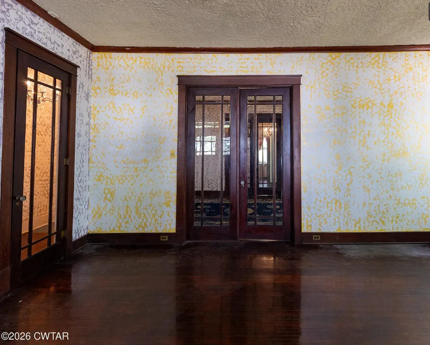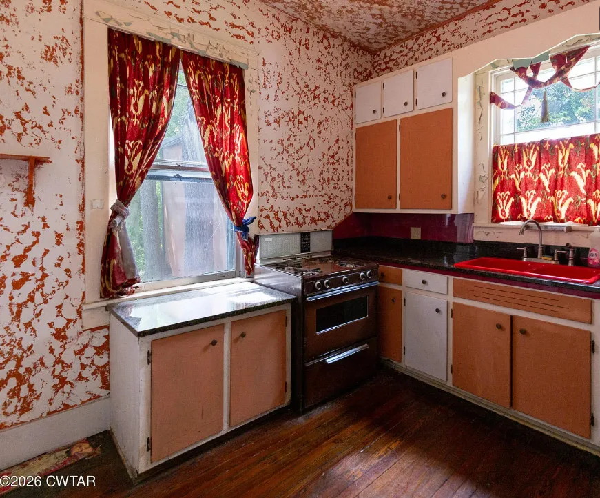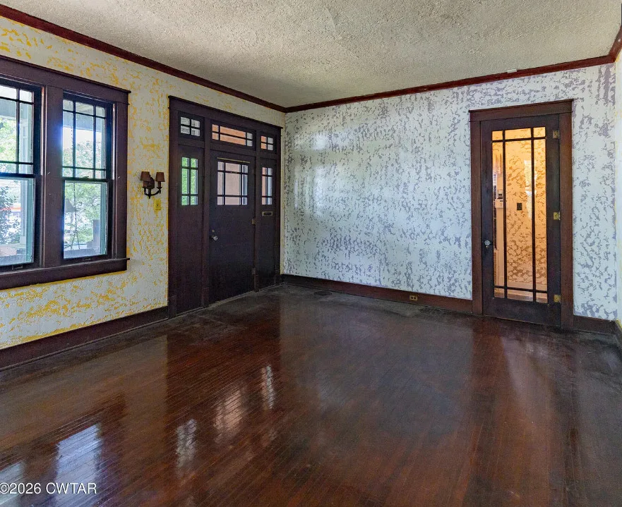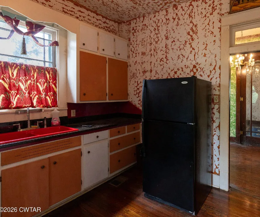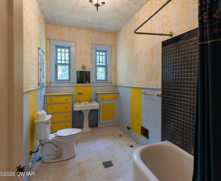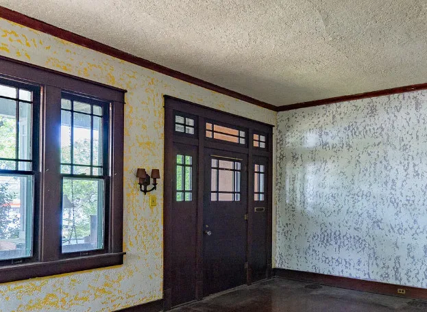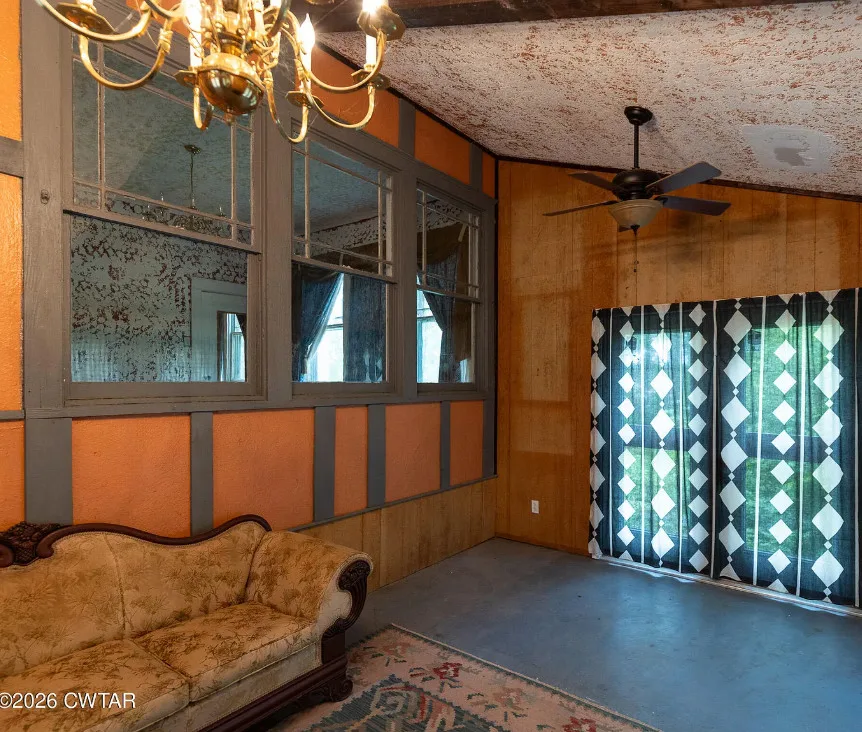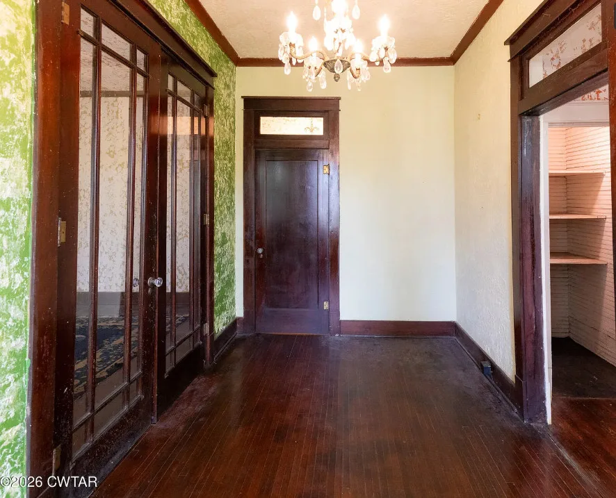 This house has lots of potential! Interior surprised me considering the price. Question, are the walls supposed to be like that? I am guessing it is some trendy DIY sponge paint thing? The house was built in 1925. It is located on .71 acre in Milan, Tennessee. This Mission Revival/Spanish Eclectic house features a covered front porch, gleaming wood floors, crown moulding, baseboards, unpainted millwork, french doors, crystal chandelier, transom windows and wainscoting. The location might not be ideal with commercial across the street. Three bedrooms, two bathrooms and 2,044 square feet. $150,000