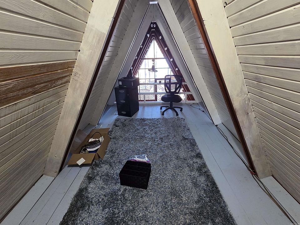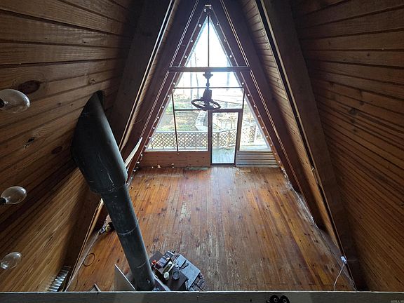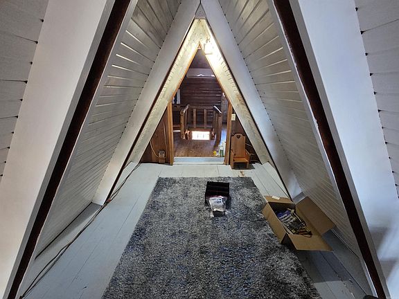 Inside, the soaring ceilings create a dramatic yet cozy atmosphere that’s difficult to replicate in traditional homes. The A-frame design draws the eye upward, enhancing the sense of space and openness. With thoughtful renovation, you could modernize the layout while preserving the cabin’s authentic charm. Consider refinishing or replacing flooring, updating lighting fixtures to complement the wood interiors, and incorporating large windows or sliding glass doors to maximize lake views. A refreshed kitchen with updated cabinetry and countertops could become the heart of the home, while renovated bathrooms would add comfort and long-term value.