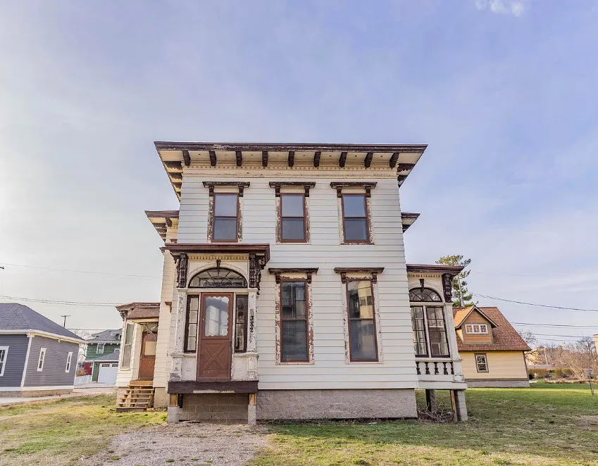 Check out the stunning woodwork in this house! I love the staircase too! The house was built in 1869. It is located in Muskegon, Michigan. The house has been moved twice to save it, the second time was in 2024. The house features arched entryways, beautiful built-ins, wood floors, bay windows, pocket doors, beautiful door entablature in dining room, wainscoting, grand staircase, beautiful sinks, original mantels and pretty chandeliers. This one will require a lot of work, but it would be a fun project. This is a big house! Seven bedrooms, three bathrooms and 5,236 square feet. $150,000