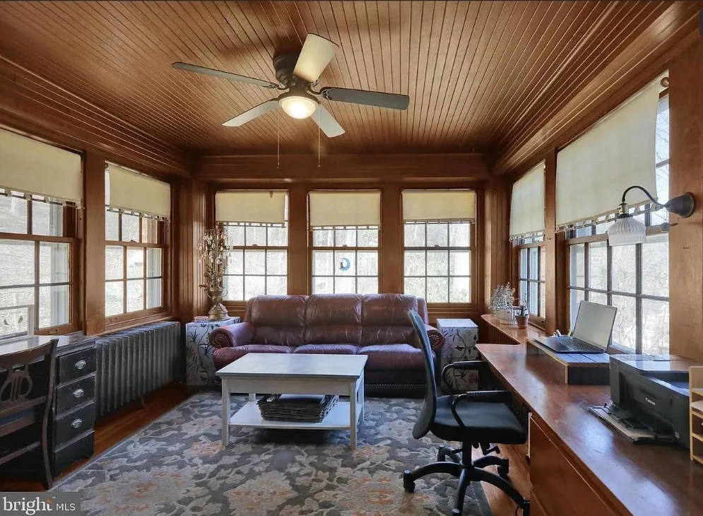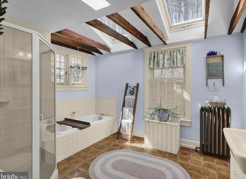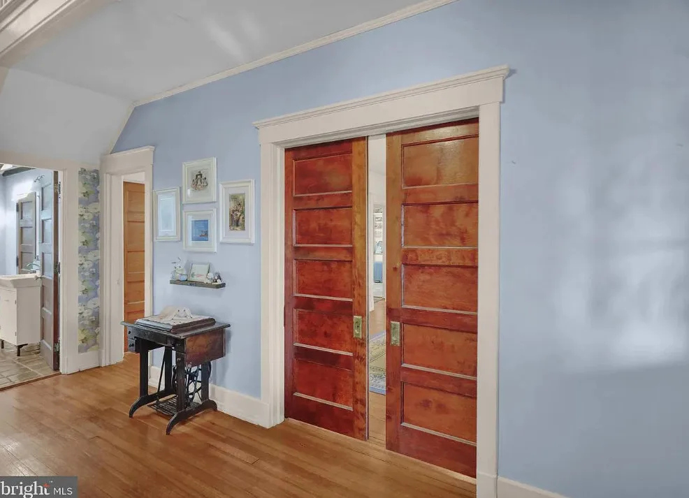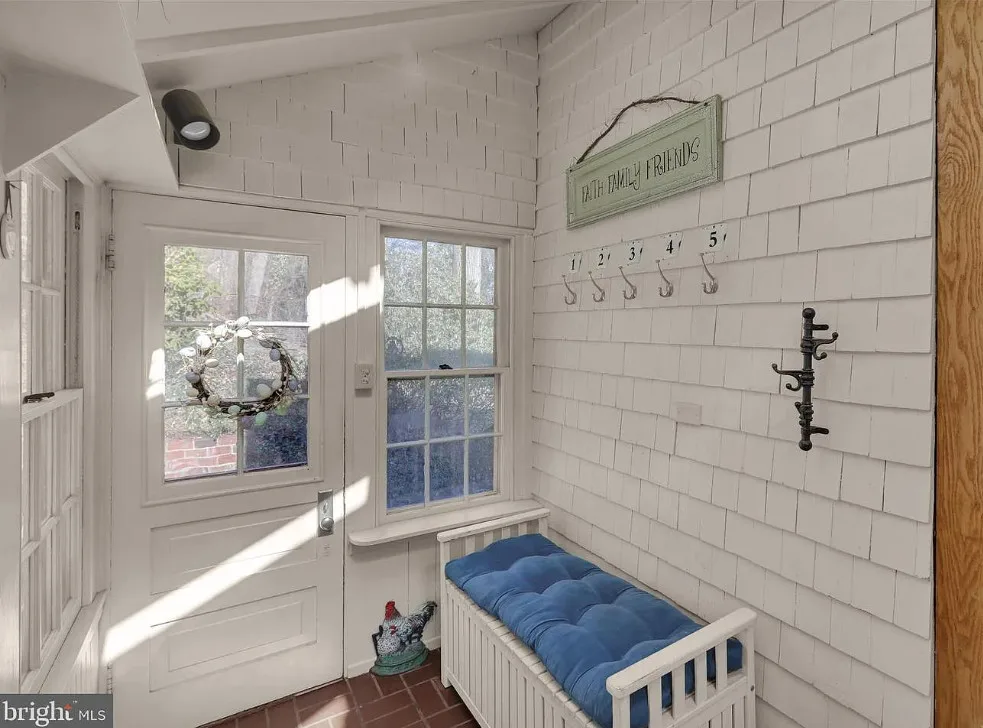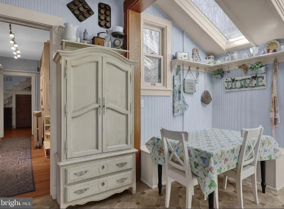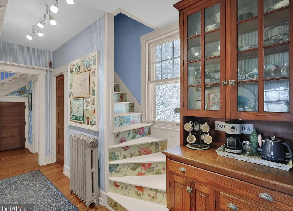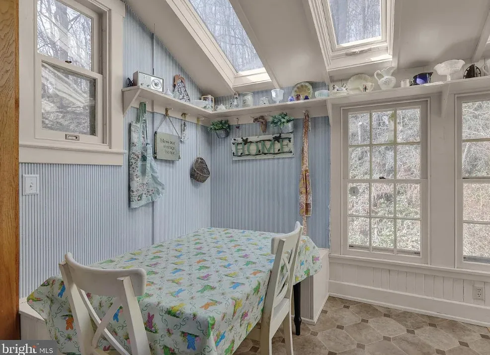 This is such a sweet interior! What is your favorite part? I love the back staircase and that stone entrance! The house was built in 1900. It is located on 6.06 acres in Reading, Pennsylvania. The house features a covered front porch, wood floors, pretty staircase, wide baseboards, vintage light fixtures, bead board, sunroom, pocket doors, exposed beams, a lot of natural light, crown moulding and a back staircase. I love amount of natural light in this house and how about that beautiful back staircase! There is a detached garage on the property and I really love the stone entrance of the driveway. Four bedrooms, two bathrooms and 3,169 square feet. $479,900