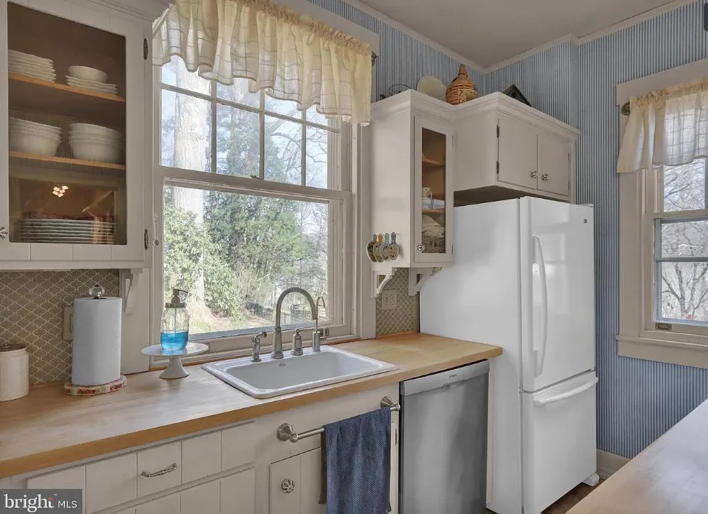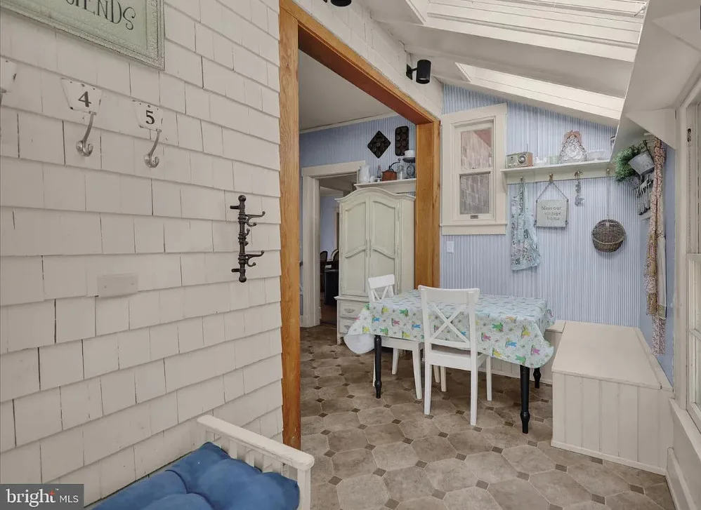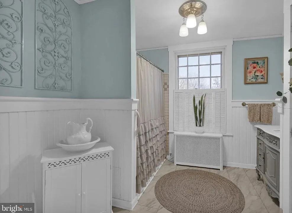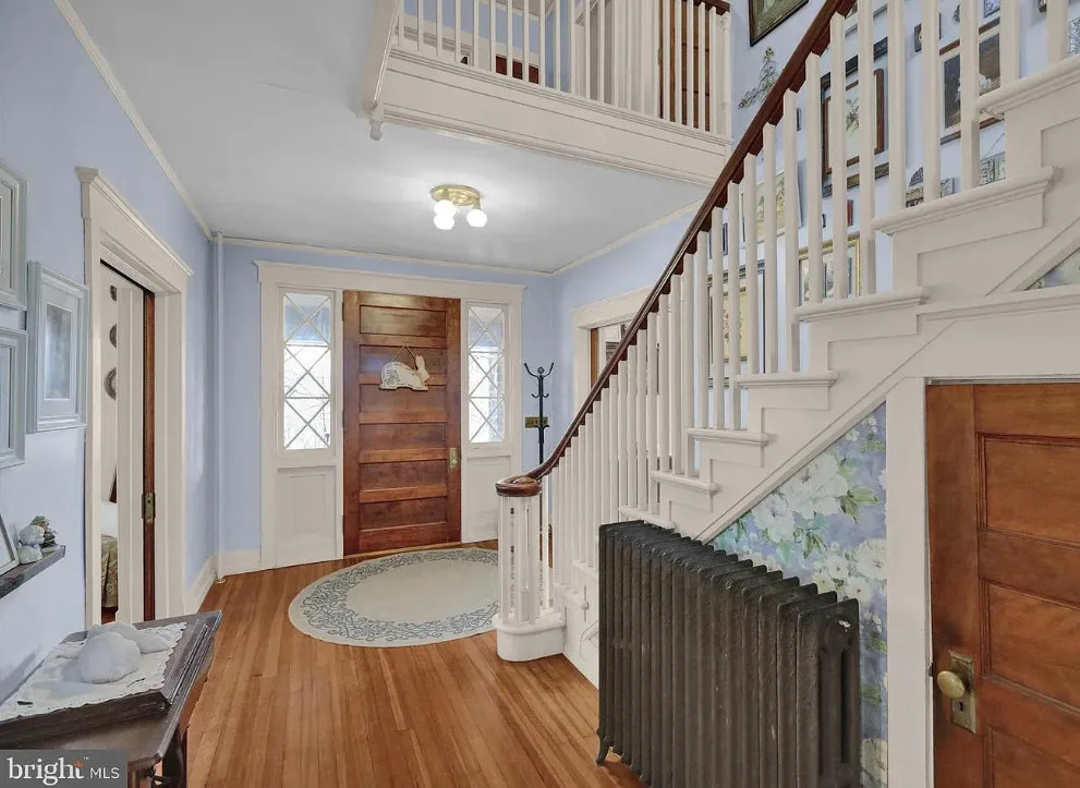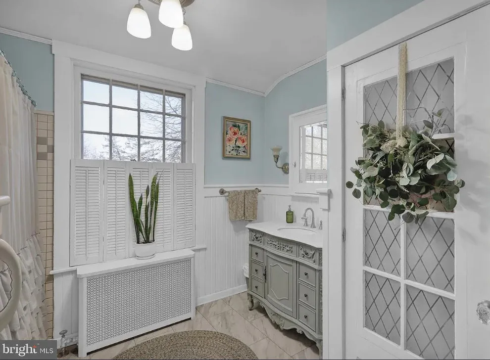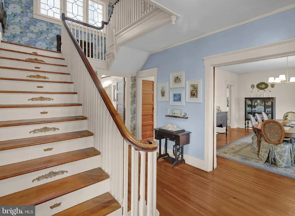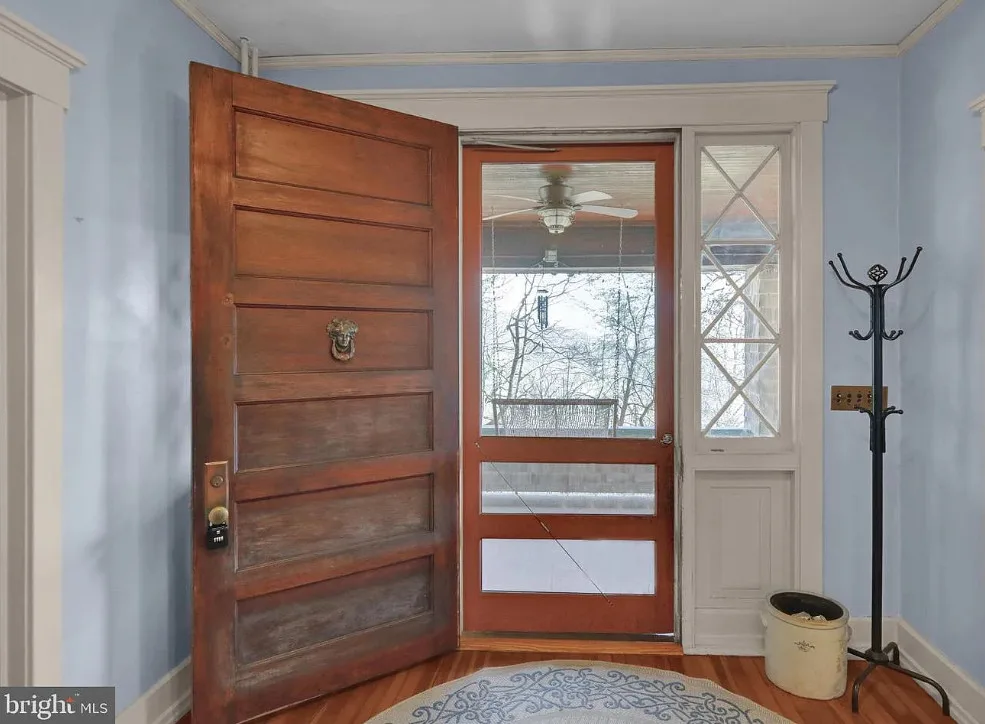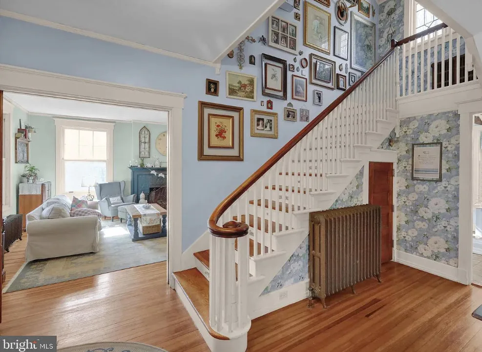 This is such a sweet interior! What is your favorite part? I love the back staircase and that stone entrance! The house was built in 1900. It is located on 6.06 acres in Reading, Pennsylvania. The house features a covered front porch, wood floors, pretty staircase, wide baseboards, vintage light fixtures, bead board, sunroom, pocket doors, exposed beams, a lot of natural light, crown moulding and a back staircase. I love amount of natural light in this house and how about that beautiful back staircase! There is a detached garage on the property and I really love the stone entrance of the driveway. Four bedrooms, two bathrooms and 3,169 square feet. $479,900