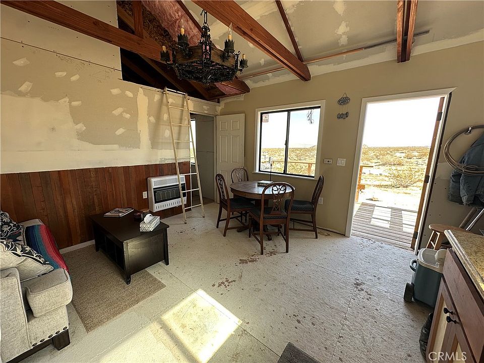 Step inside and you’ll immediately appreciate the inviting, open layout designed for comfort and versatility. The interior is spacious and ready for your personal touch, blending rustic character with modern conveniences. Exposed beams stretch overhead, adding warmth and architectural charm. A distinctive chandelier creates a focal point in the main living area, giving the space personality and flair. Natural light pours through strategically placed windows, illuminating the cabin and drawing your eye outward to the panoramic desert scenery.