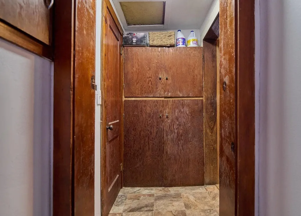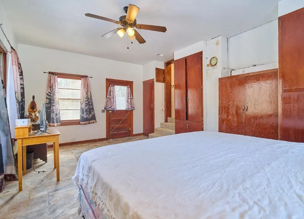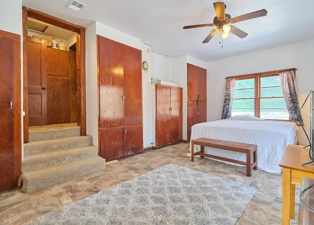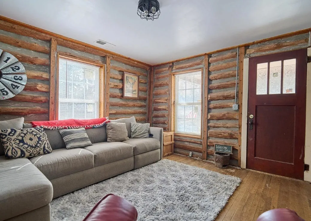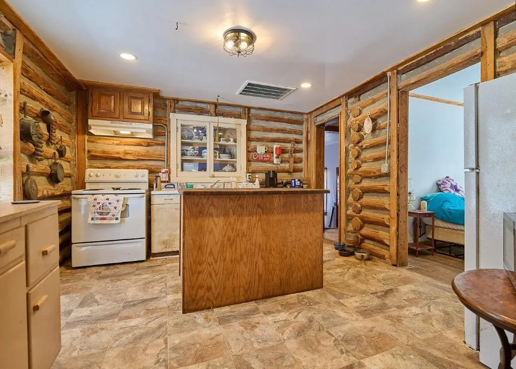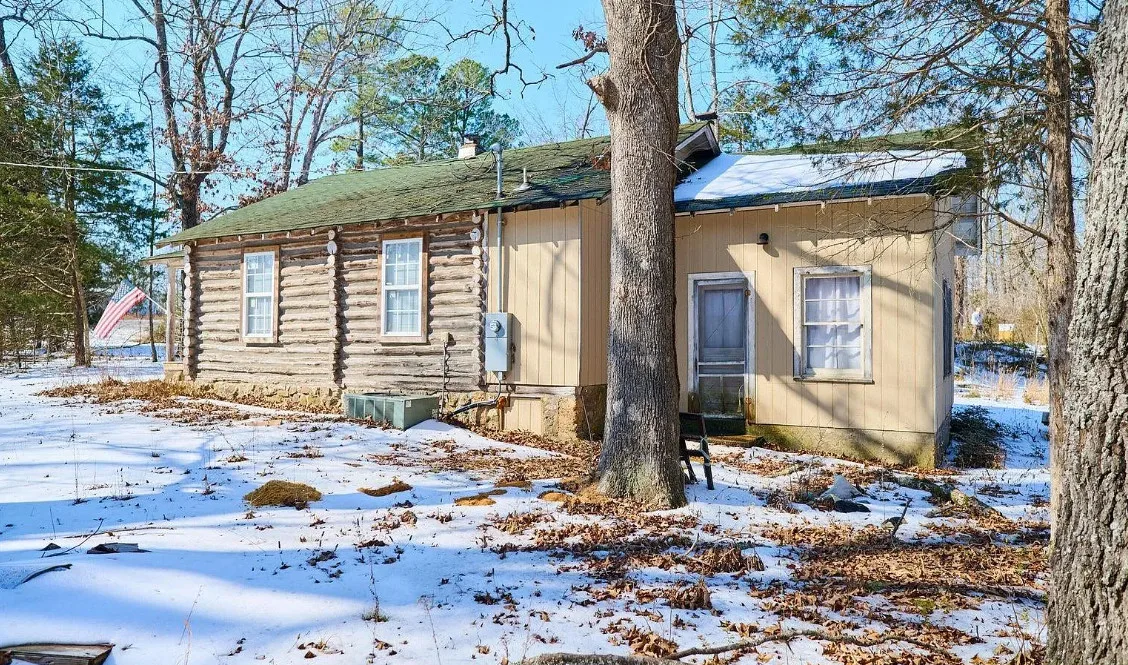 This has a nice interior! Nice acreage too! The house was built in 1908. It is located on 13 acres in Williford, Arkansas. The house features a covered front porch, wood floors, log walls, corner cabinet and crown moulding. There are a couple of outbuildings and a carport for an RV. Two bedrooms, one bathroom and 1,008 square feet. $164,900