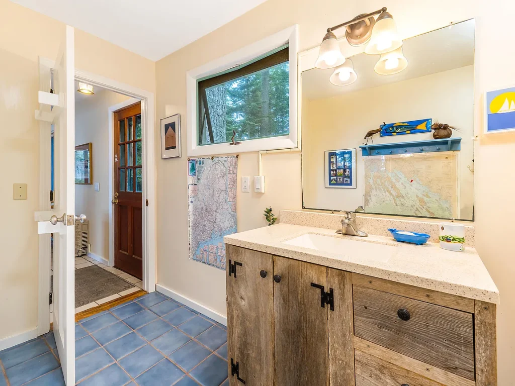 The three-bedroom, two-bath Salt Box cottage blends rustic charm with practical comfort. Its shingle-style exterior fits seamlessly into the coastal landscape, while the interior offers warmth, character, and thoughtful functionality.