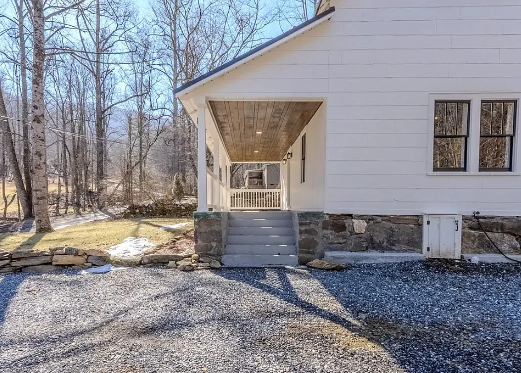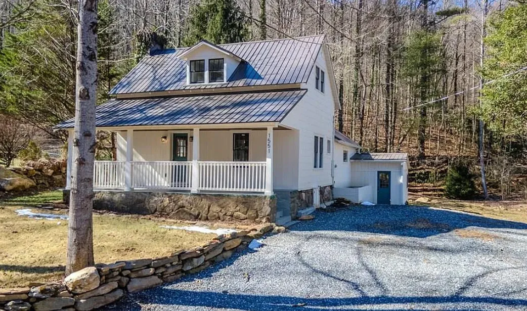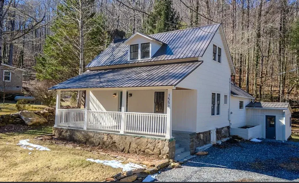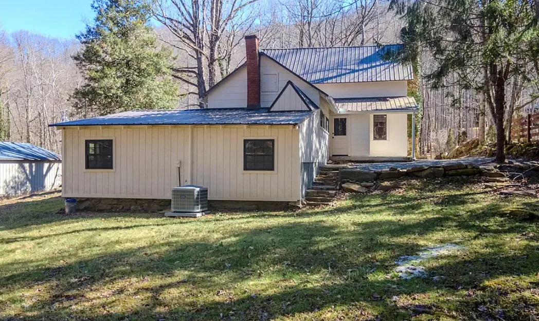 Timeless character meets modern updates in this beautifully renovated 1890s farmhouse cottage. Recent improvements include a brand-new metal roof and a brand new HVAC system, offering comfort and peace of mind. The remodeled eat-in kitchen features new cabinets, granite countertops, brick floors, a farmhouse sink and higher-end appliances, including a 5-burner THOR range, blending classic charm with everyday functionality. A versatile bonus room provides flexible space for a home office, studio, or hobby area. Enjoy the inviting front porch looking toward a rushing creek with multiple small waterfalls, creating a peaceful and scenic backdrop. Tucked into a welcoming neighborhood, this property offers the perfect blend of historic appeal and tranquil outdoor living. Portions of the home were updated by the owner and were not permitted. Laundry gray water currently drains onto the property rather than the septic system. A previous inspection noted evidence of powder post beetles. Buyers encouraged to conduct due diligence and verify all systems. including, HVAC, electrical, plumbing and roof also the firepace need work to be functional.