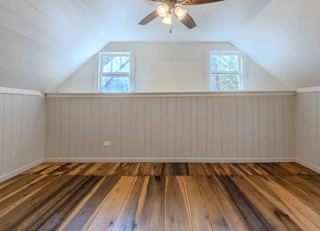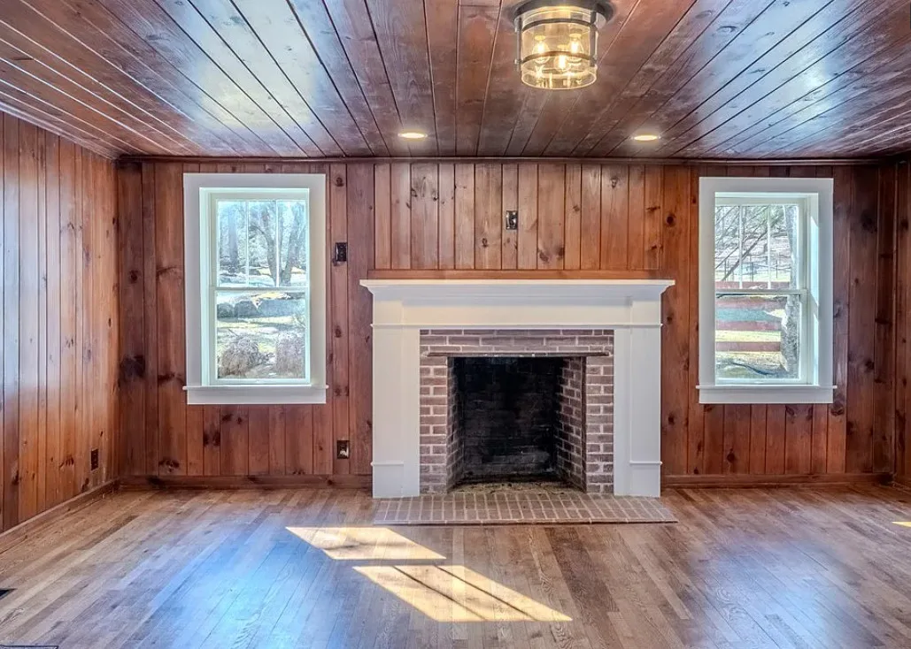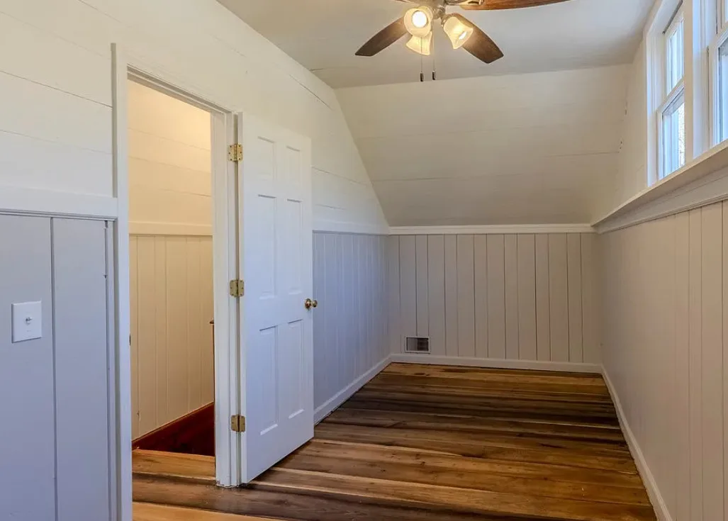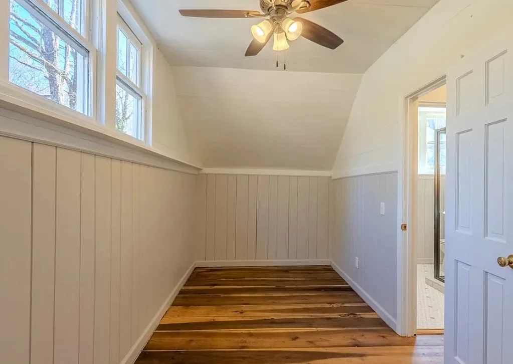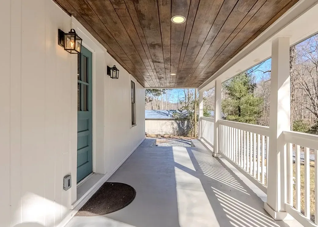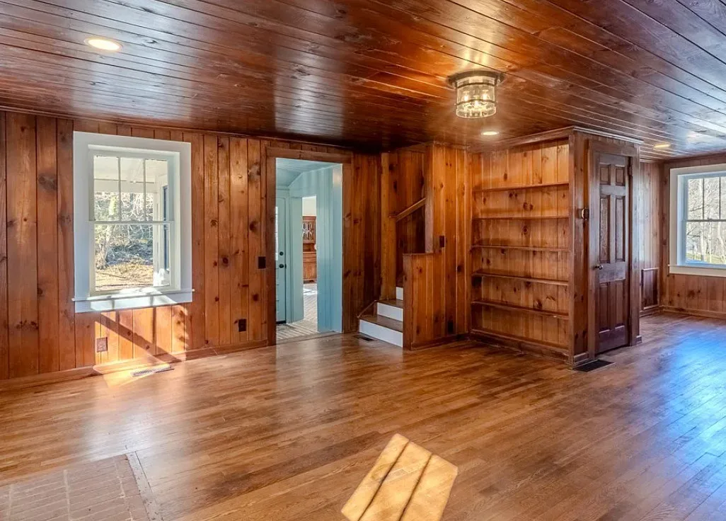 I love the creek that is across the road from the house! The kitchen floor is pretty! The house was built in 1890. It is located on .59 acre in Franklin, North Carolina. The house features a covered front porch, updated kitchen with pretty flooring, knotty pine, wood floors, built-in bookshelves, large fireplace, wainscoting and updated bathrooms. The house has a new roof and new HVAC. This is a real pretty area of the North Carolina mountains. Two bedrooms and two bathrooms. $339,000