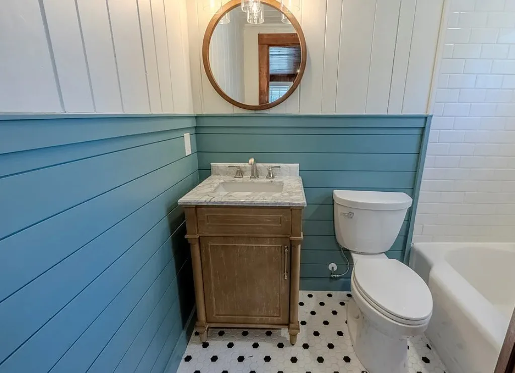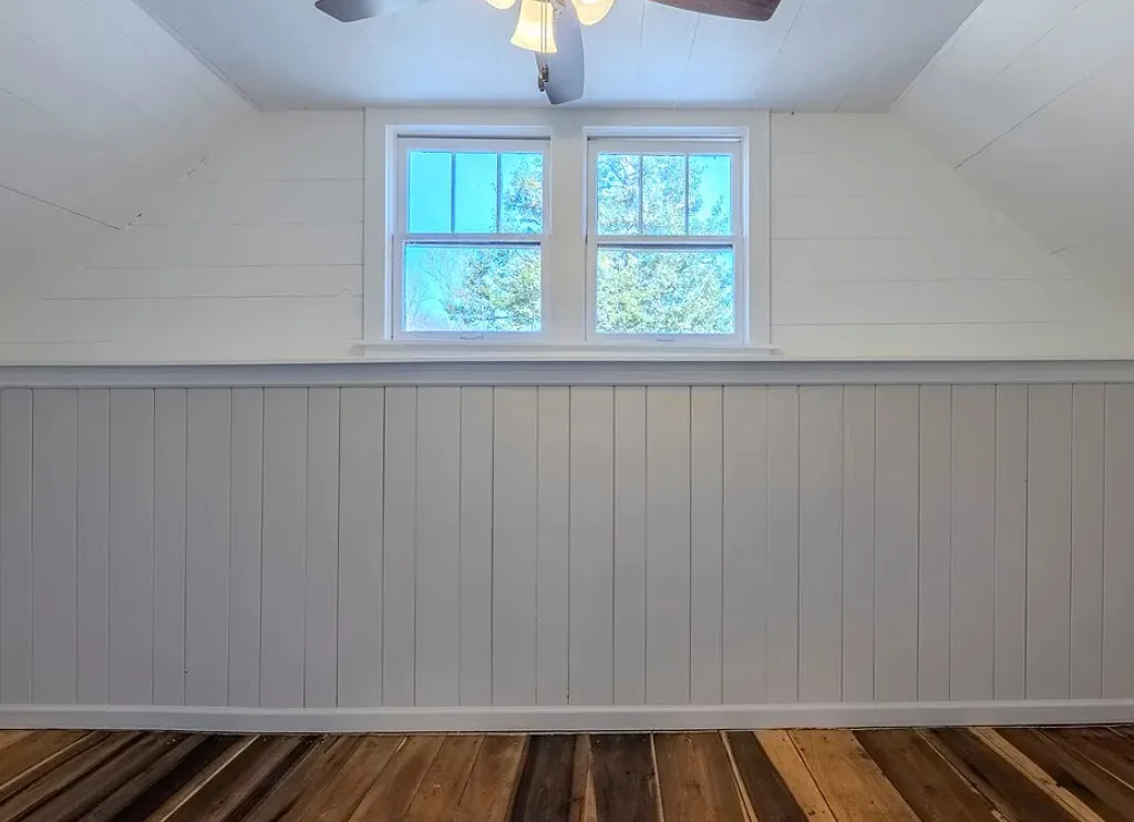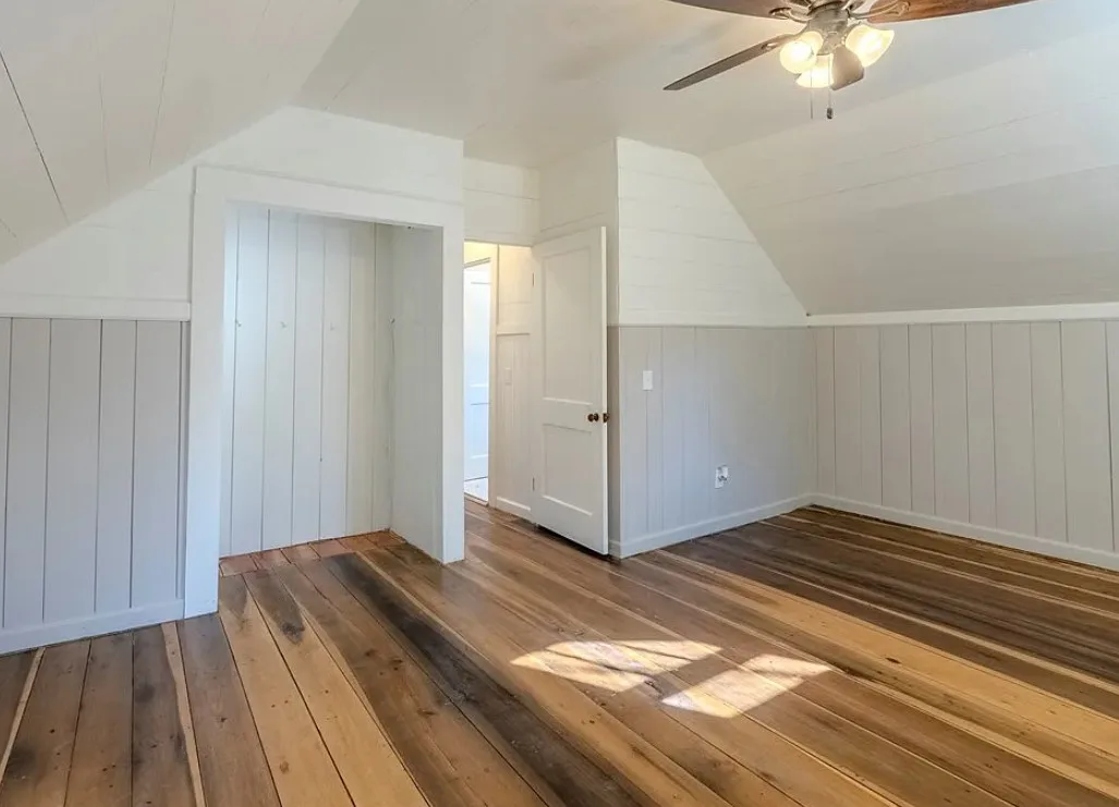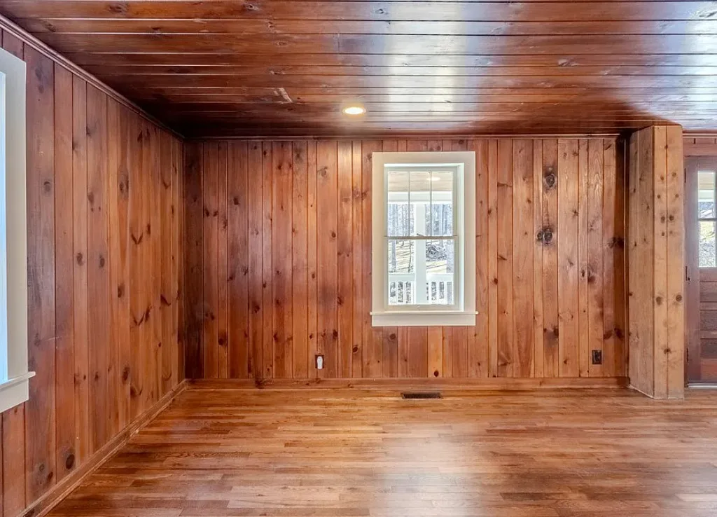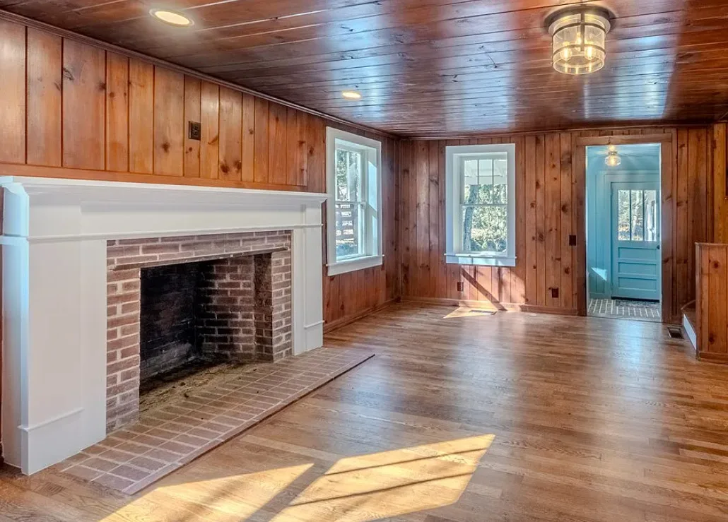 I love the creek that is across the road from the house! The kitchen floor is pretty! The house was built in 1890. It is located on .59 acre in Franklin, North Carolina. The house features a covered front porch, updated kitchen with pretty flooring, knotty pine, wood floors, built-in bookshelves, large fireplace, wainscoting and updated bathrooms. The house has a new roof and new HVAC. This is a real pretty area of the North Carolina mountains. Two bedrooms and two bathrooms. $339,000