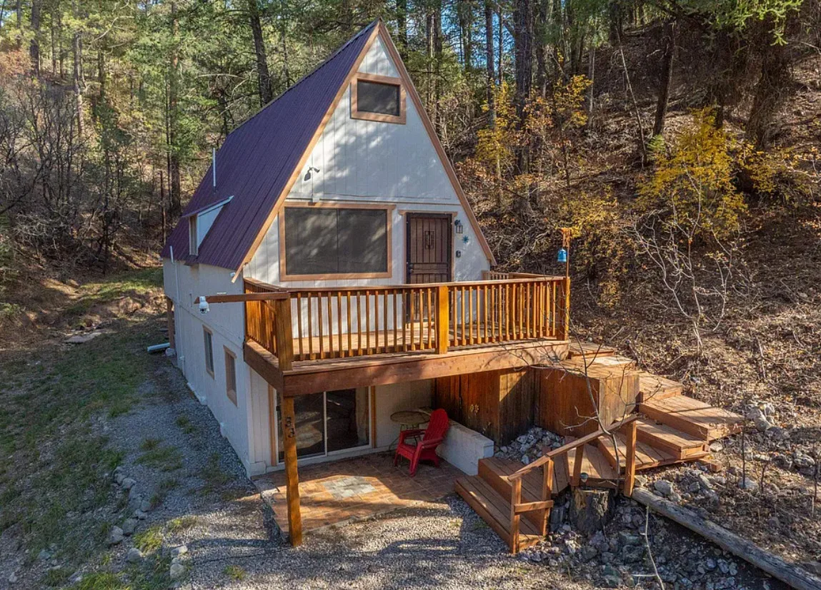This house in New Mexico is being sold fully furnished! Such pretty scenery! The house was built in 1960. It is located on .37 acre in High Rolls Mountain Park, New Mexico. The house features a front deck, vaulted ceiling, knotty pine, wood floors and a loft area. Pretty scenery around this house. The house has a newer roof. Two bedrooms, two bathrooms and 1,318 square feet. $229,000