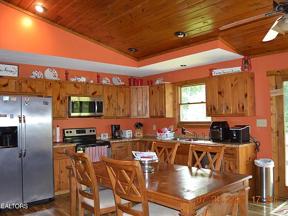 The kitchen is designed to support both everyday living and special occasions. Equipped with stainless steel appliances—including a range, microwave, dishwasher, and refrigerator—it provides everything needed for cooking and entertaining. The eat-in kitchen layout encourages casual meals and conversation, making it a natural hub of activity within the home.