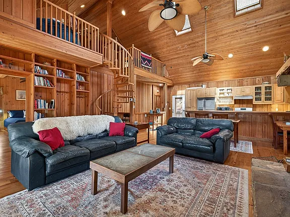 Inside, the home showcases a custom wood interior that reflects true craftsmanship and thoughtful design. Warm wood tones, combined with tile and wood flooring, create a rich yet comfortable atmosphere throughout the living spaces. Every detail feels intentional, blending rustic charm with refined finishes. Solid wood cabinetry anchors the kitchen and living areas, offering both beauty and functionality. Built-in bookshelves add character and practicality, making the home feel both elegant and lived-in.