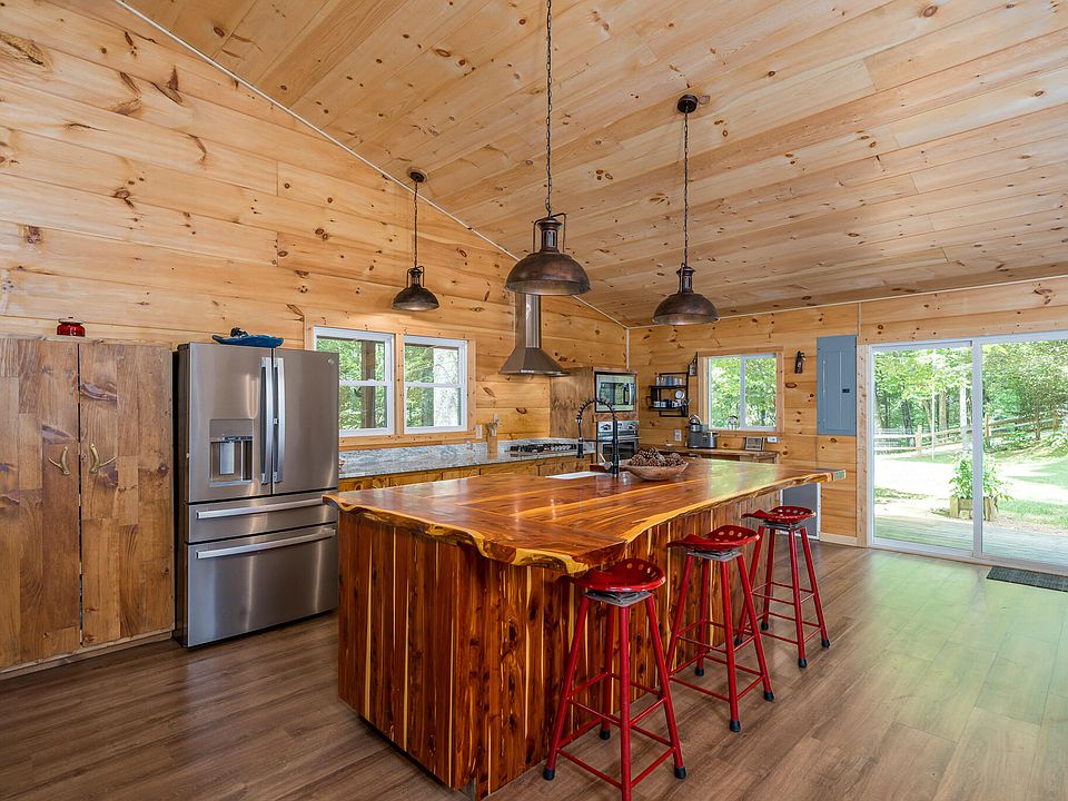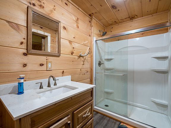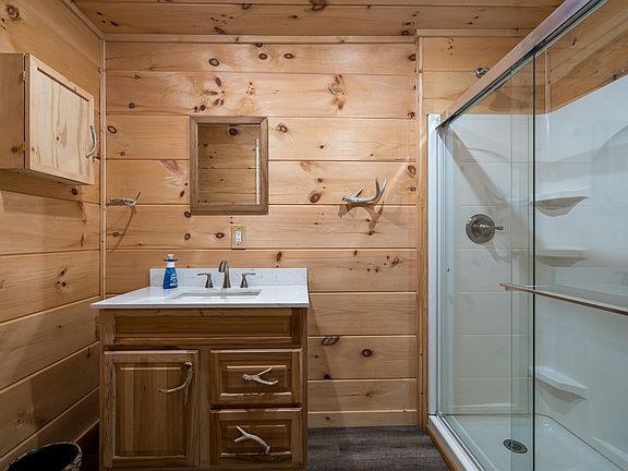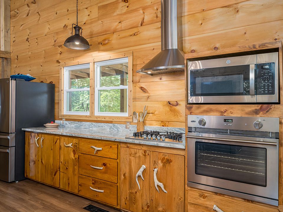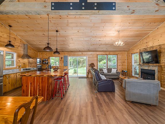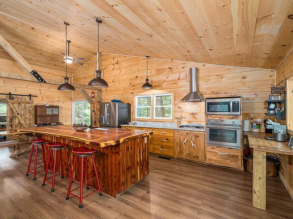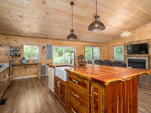 The kitchen is a standout feature, thoughtfully designed for both everyday living and hosting. Custom cabinetry provides ample storage, while the large live-edge island serves as a stunning focal point—perfect for meal prep, casual dining, or gathering with friends and family. The blend of rustic elements and modern finishes creates a kitchen that feels both timeless and current. Brand-new luxury vinyl plank flooring runs throughout the home, offering durability, easy maintenance, and a warm aesthetic that complements the cabin’s natural wood tones.