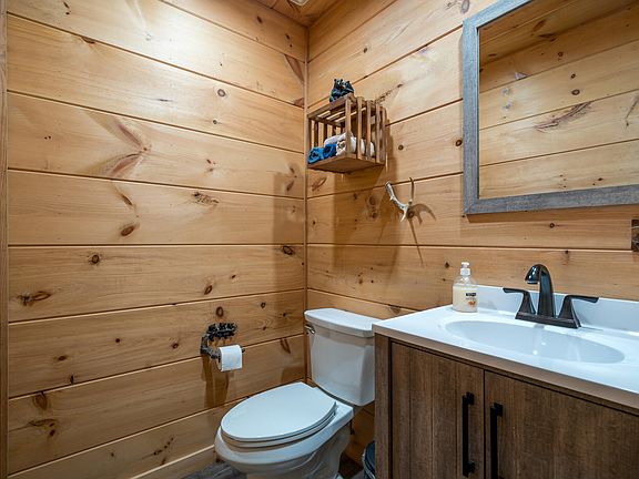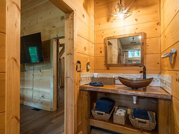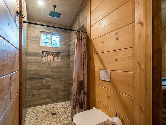 The main level of the home features two spacious bedrooms, each offering direct access to the expansive wraparound deck. Waking up to the sights and sounds of the forest, with fresh mountain air just steps away, is an experience few homes can offer. These bedrooms are generously sized and thoughtfully placed to maximize privacy and comfort.