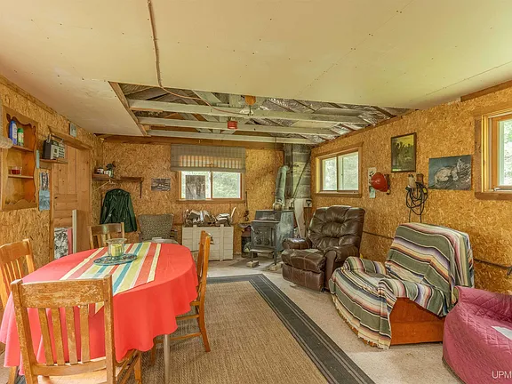 At the heart of the acreage sits a rustic camp, perfectly positioned to complement the surrounding wilderness. The camp is simple, functional, and thoughtfully equipped for comfortable stays throughout much of the year. A wood-burning stove provides reliable heat and a cozy atmosphere, making the camp an inviting retreat during cooler months. There’s something deeply satisfying about warming the space with a fire after a day spent outdoors, surrounded by snow-covered trees or crisp autumn air.