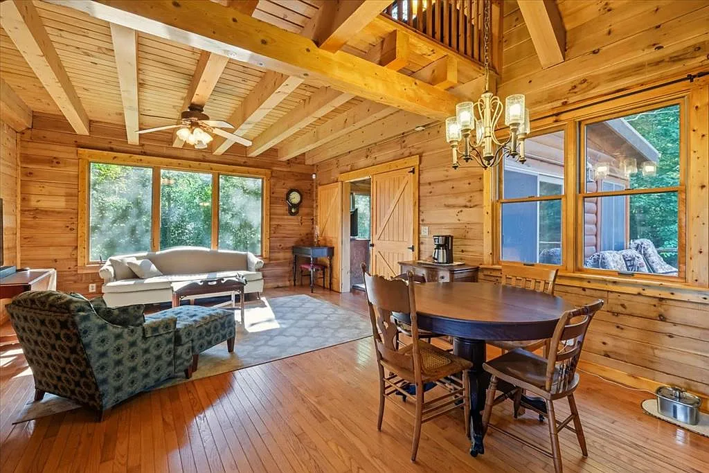 Built in 2001, the cabin embraces traditional log construction while offering an open, airy interior. Blending craftsmanship with comfort, the home feels both cozy and expansive—thanks in part to vaulted ceilings, natural wood textures, and abundant natural light.