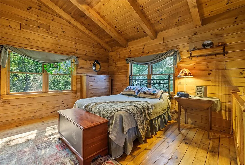 A loft bedroom overlooking the great room—a classic cabin feature that adds charm and additional space