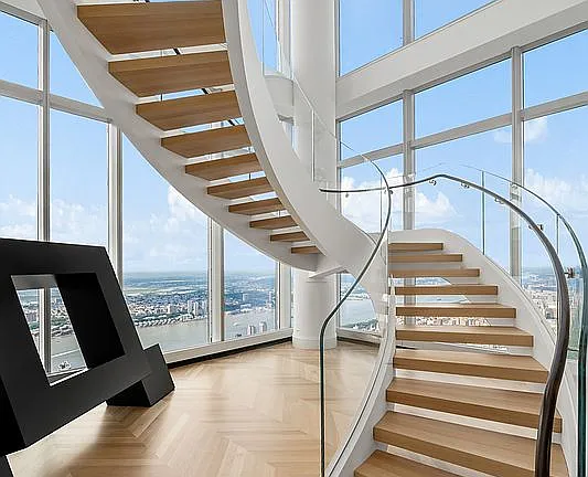 At the heart of the residence lies a breathtaking double-height stair hall, an architectural showpiece that defines the home’s vertical drama. A glass-enclosed sculptural staircase ascends gracefully to the upper level, serving as both a functional element and a work of art. This striking feature enhances the sense of openness while reinforcing the residence’s unique identity as a true duplex in the sky.