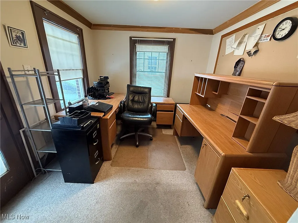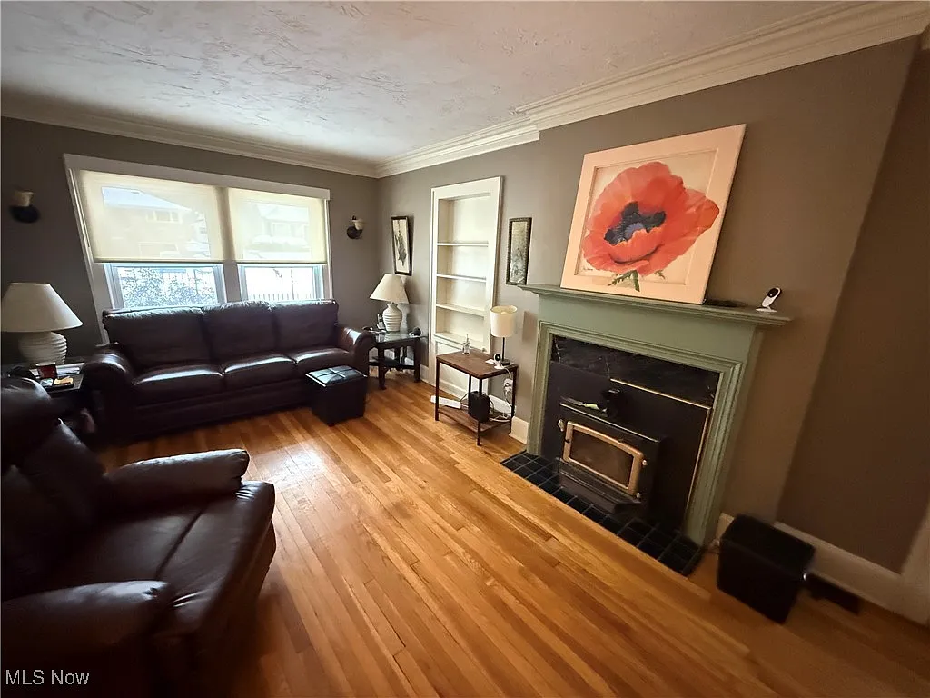 Living Room: Spacious and filled with natural light, featuring hardwood flooring and classic crown molding