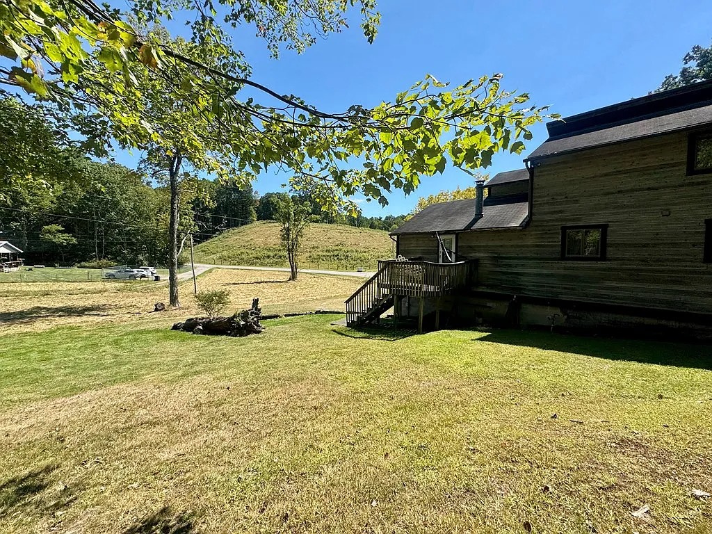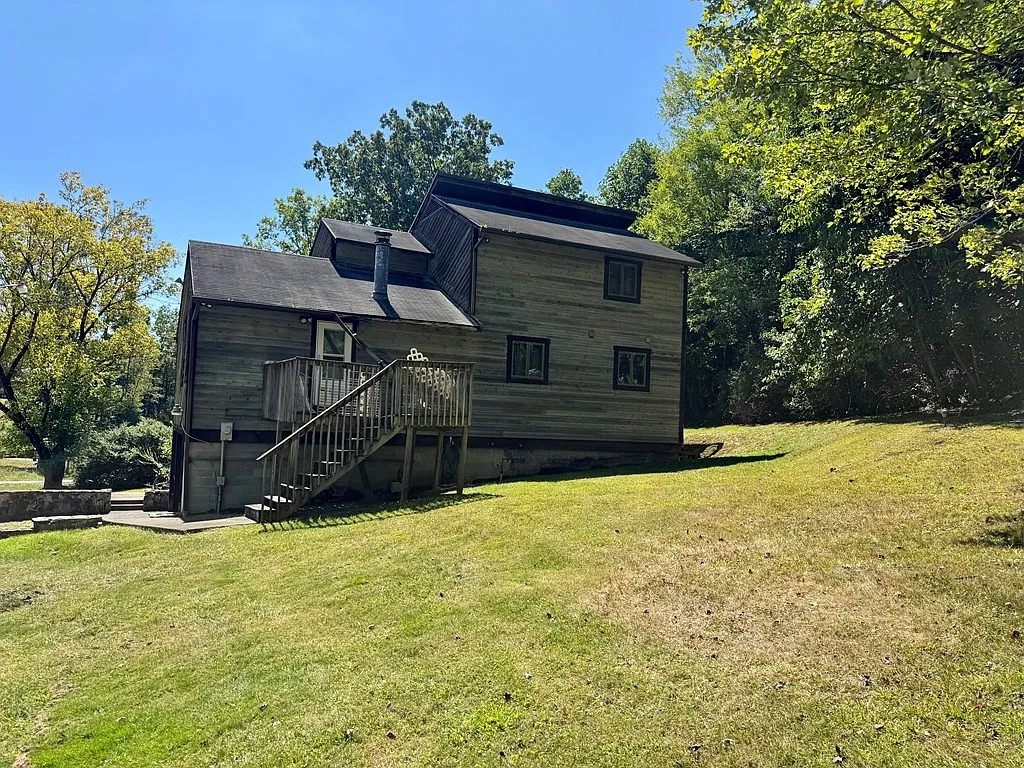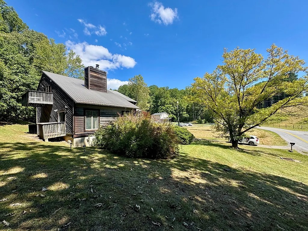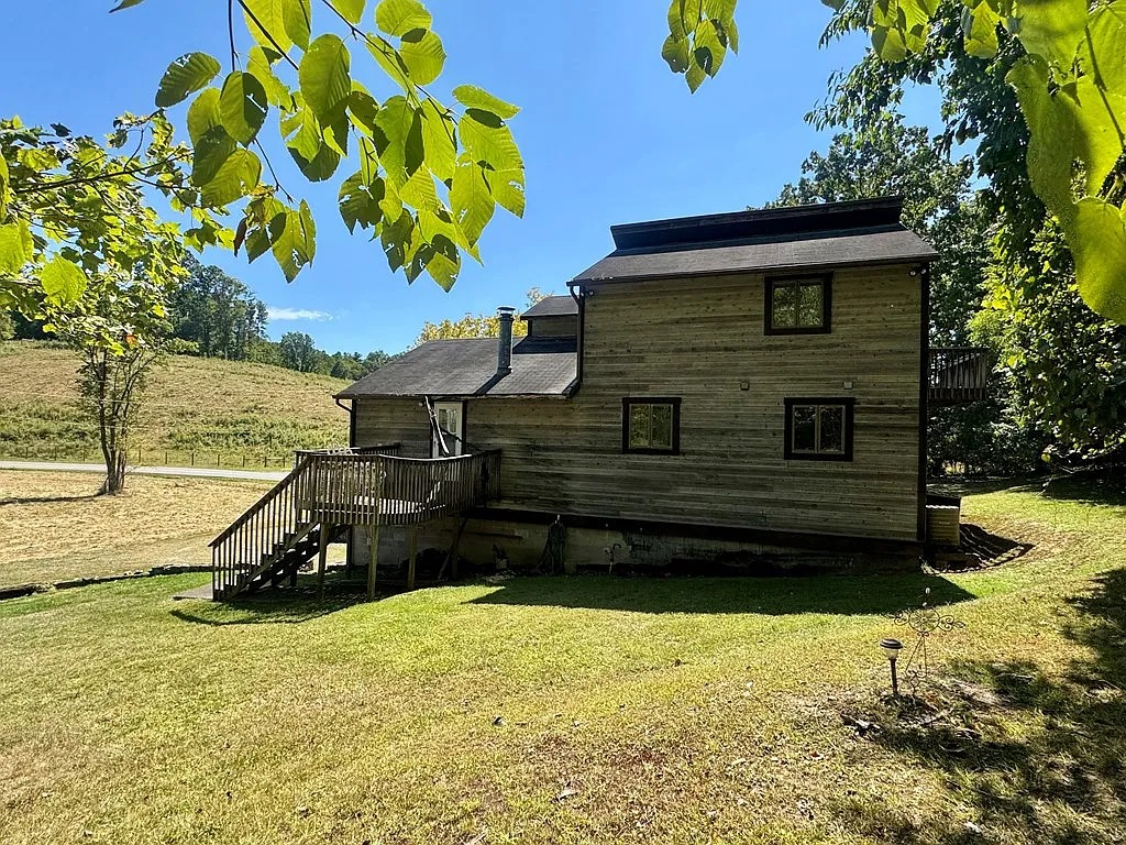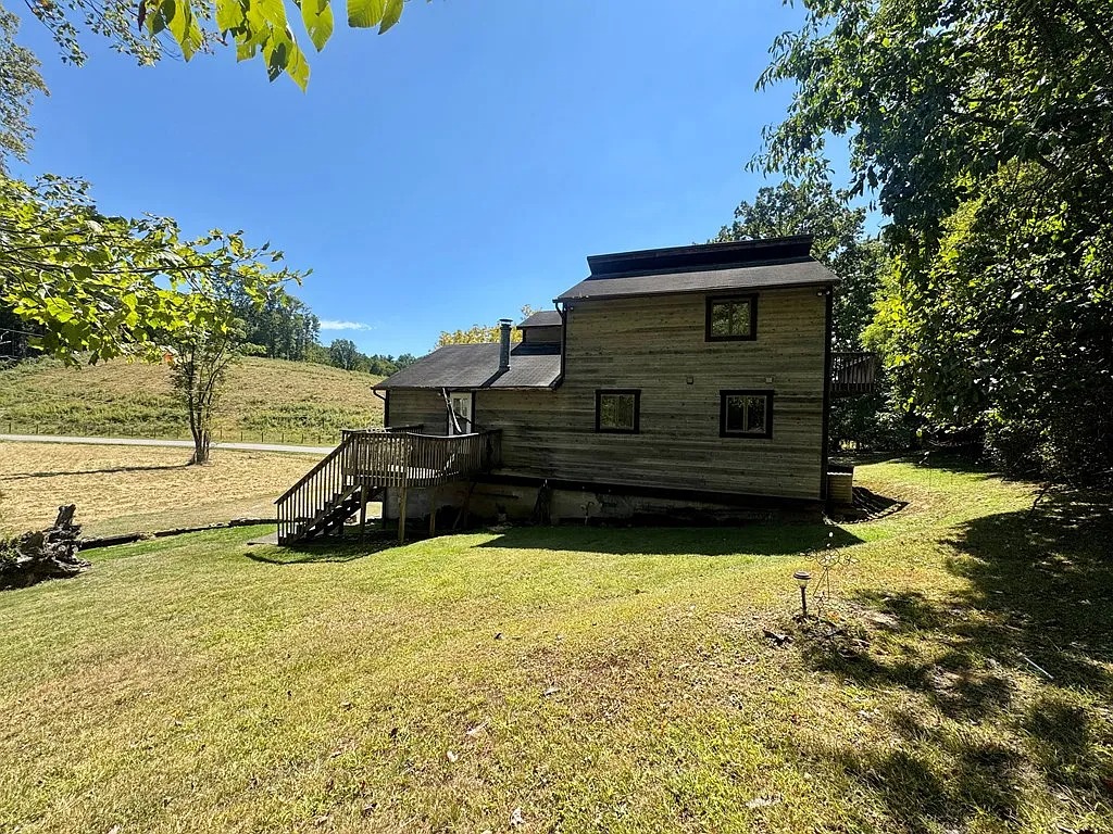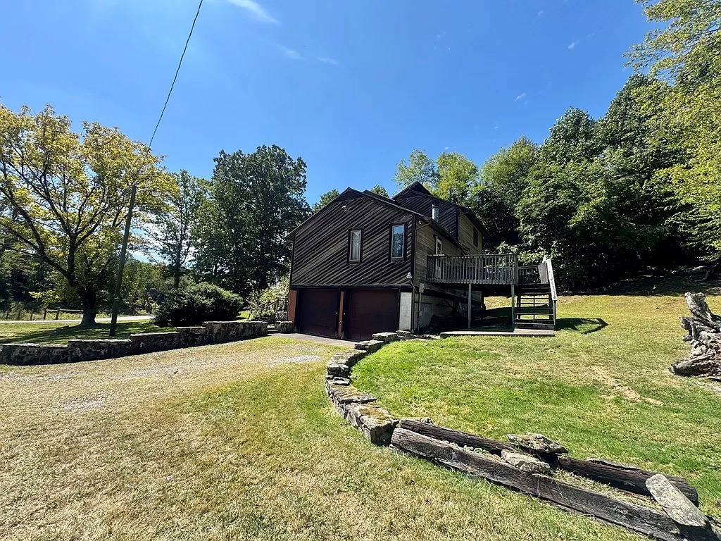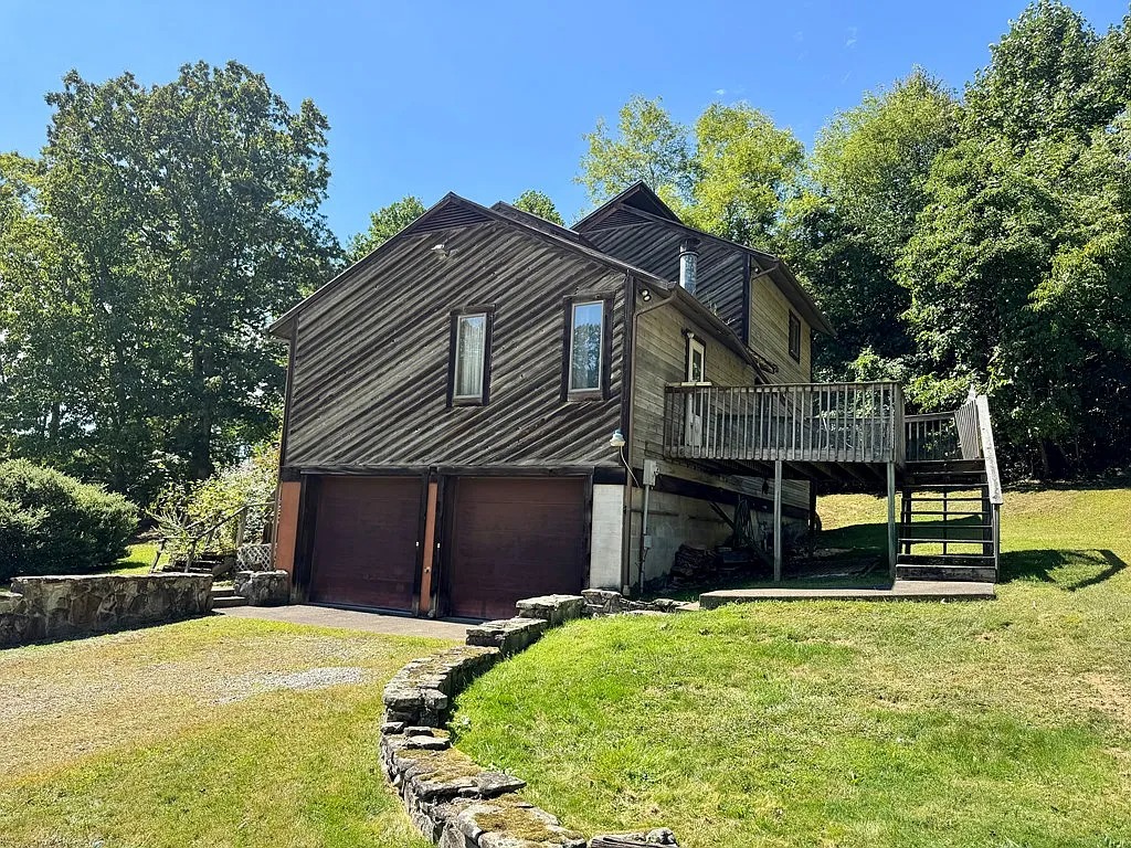 This unique wood home in Beckley offers a spacious layout, striking architecture, and plenty of potential. Moreover, the vaulted ceilings and exposed beams immediately create a warm, lodge-style feel. Furthermore, the dramatic stone fireplace anchors the living room and enhances the inviting atmosphere. In addition, sliding doors on both sides of the room bring in natural light and easy outdoor access. Because of this layout, the main level feels open and connected. Meanwhile, the sunken dining area and wet bar expand the entertainment possibilities. Also, the adjoining kitchen flows to an outdoor deck area ready for future upgrades.